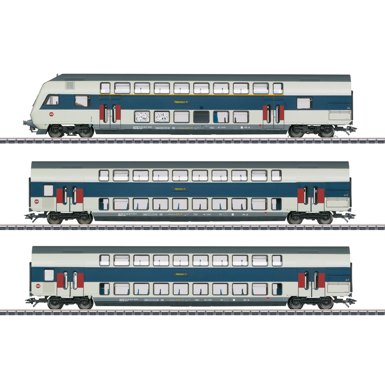 Modell: Auf Basis der Doppelstockwagen DBz 751 und DBbzf 761. Alle Wagen vorbereitet für stromführende Wagenverbindung, entweder mit steckbaren Kurzkupplungsdeichseln 7319, oder trennbaren Kurzkupplungen 72020/72021. Steuerwagen mit detaillierter Pufferbohle mit angesetztem Frontspoiler. Beleuchtete und bedruckte Zugzielanzeige. Führerstand mit Inneneinrichtung. Bei schiebender Lokomotive (Steuerwagen voraus) leuchtet am Steuerwagen ein weißes Dreilicht-Spitzensignal, bei ziehender Lokomotive (Lok voraus) brennen am Steuerwagen zwei rote Schlusslichter. Alle Wagen vorbereitet zum Einbau der Innenbeleuchtung 73140. Jeder Wagen einzeln verpackt.Gesamtlänge über Puffer ca. 81 cm.