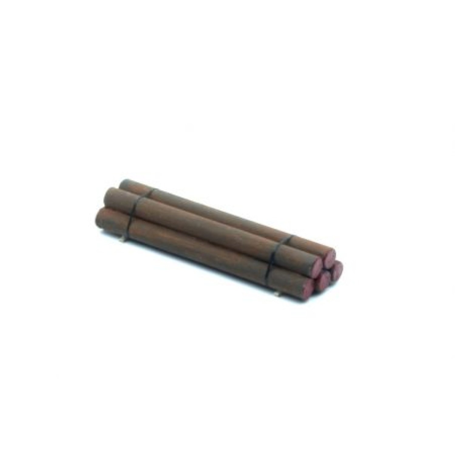 5 Rundstahlstangen gebündelt auf Unterlegbalken mit roten Stirnseiten. Die Farbe ist leicht angerostet. Abmessungen: L x B x H ca. : 69 x 18 x 11 mm