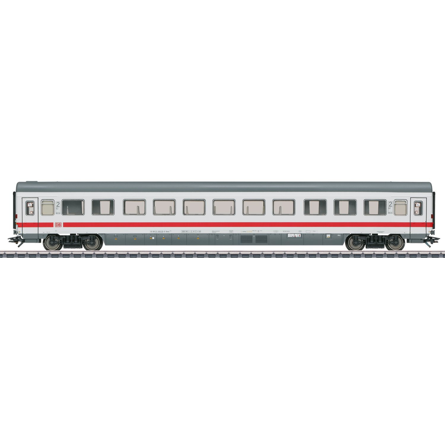 Vorbild: Abteilwagen Bvmz 185.5 2. Klasse der Deutschen Bahn AG (DB AG) für den Fernverkehr. Lichtgraue Fernverkehrs-Farbgebung mit verkehrsrotem Zierstreifen. Wagenlauf: IC 2013 von Dortmund nach Oberstdorf. Wagen-Ordnungsnummer 10. Betriebszustand 2003.