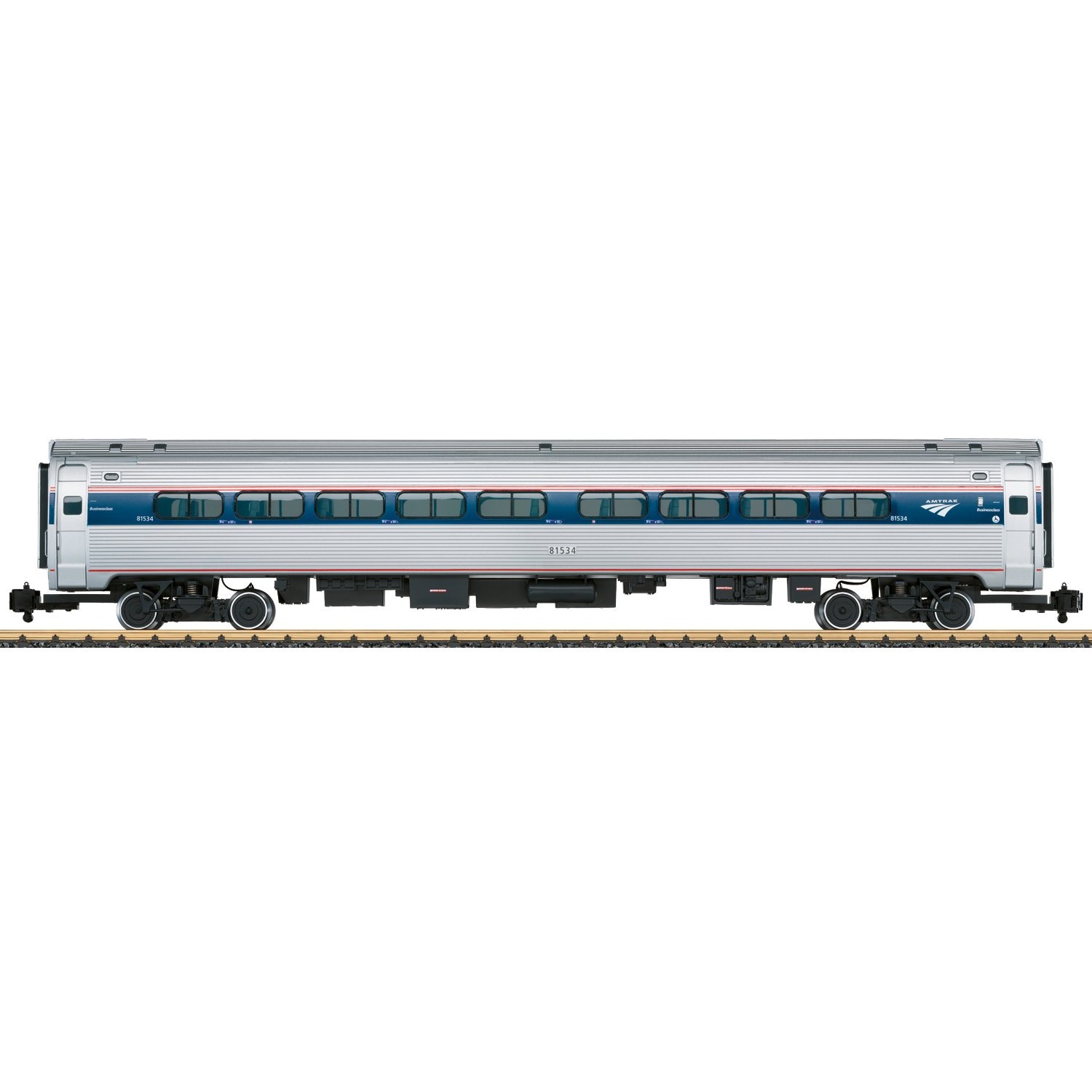 Modell eines Personenwagens der Bauart "Amfleet" der amerikanischen Personenverkehrsgesellschaft Amtrak, Ausführung als Wagen der Businessclass. Farbgebung und Beschriftung sind vorbildgerecht für Epoche VI. Serienmässig ausgestattet mit kompletter Inneneinrichtung und Innenbeleuchtung mit LED. Metallradsätze, davon 2 Kugellagerradsätze zur Stromabnahme. Ab Werk ausgerüstet mit US-Klauenkupplungen, LGB-Systemkupplungen liegen bei.