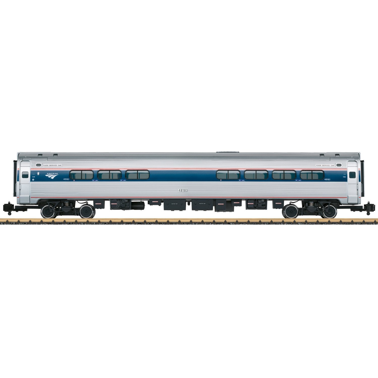 Modell eines Cafewagens der Bauart "Amfleet"® der amerikanischen Personenverkehrsgesellschaft Amtrak, Ausführung als Cafewagen "Club". Farbgebung und Beschriftung entsprechend der Epoche VI. Serienmässig ausgestattet mit kompletter Inneneinrichtung und Innenbeleuchtung mit LEDs. Metallradsätze, davon 2 Kugellagerradsätze zur Stromabnahme. Ab Werk ausgerüstet mit US-Klauenkupplungen, LGB-Systemkupplungen liegen bei.