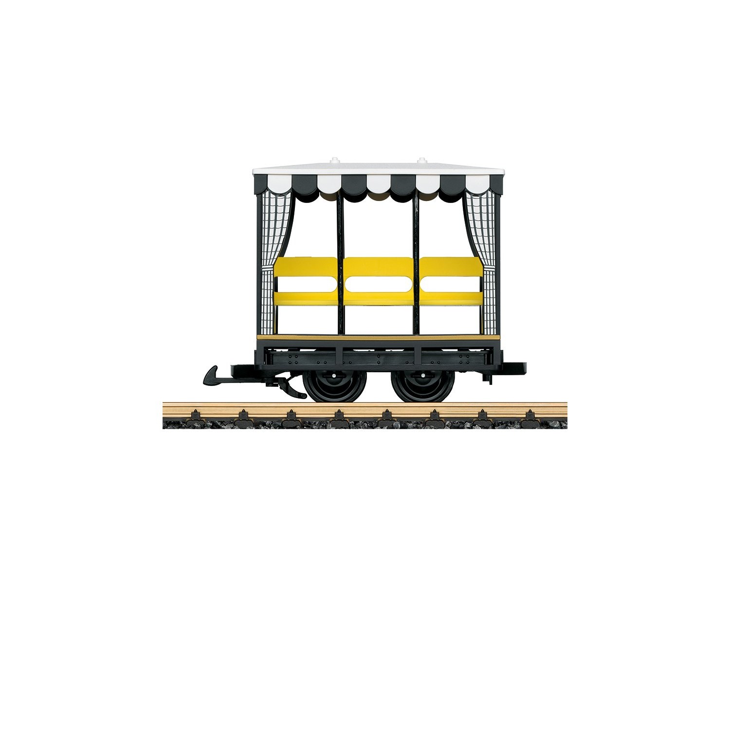 Modell eines Aussichtswagens, wie er oft auf Parkbahnen oder Feldbahnen eingesetzt wird. Länge über Puffer 17 cm.