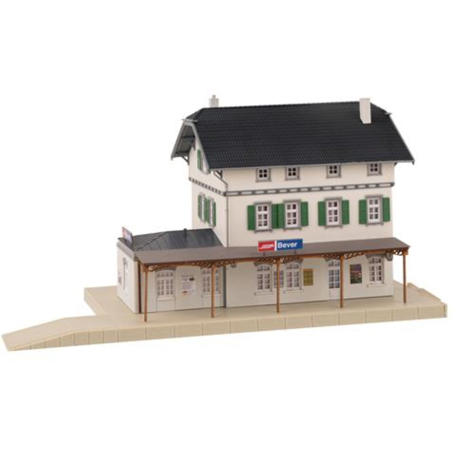 Schmuckstück der Albulalinie. Modell in Anlehnung an das dreigeschossige Stationsgebäude »Bever« mit weißer Ziegelfassade im Erdgeschoss, mit weißen Schindeln verkleideten Obergeschossen und einem mit Ziegeln bedeckten, hervorkragenden Krüppelwalmdach. Als Fundament des Modells dient ein Sockel mit Stufen, Rampe und Bahnsteig. Die Albulabahn im Schweizer Kanton Graubünden verbindet Thusis am Hinterrhein mit dem Kurort St. Moritz im Engadin. Der Bausatz besteht aus einem Materialmix aus Kunststoff und Holz/Spezialkarton.