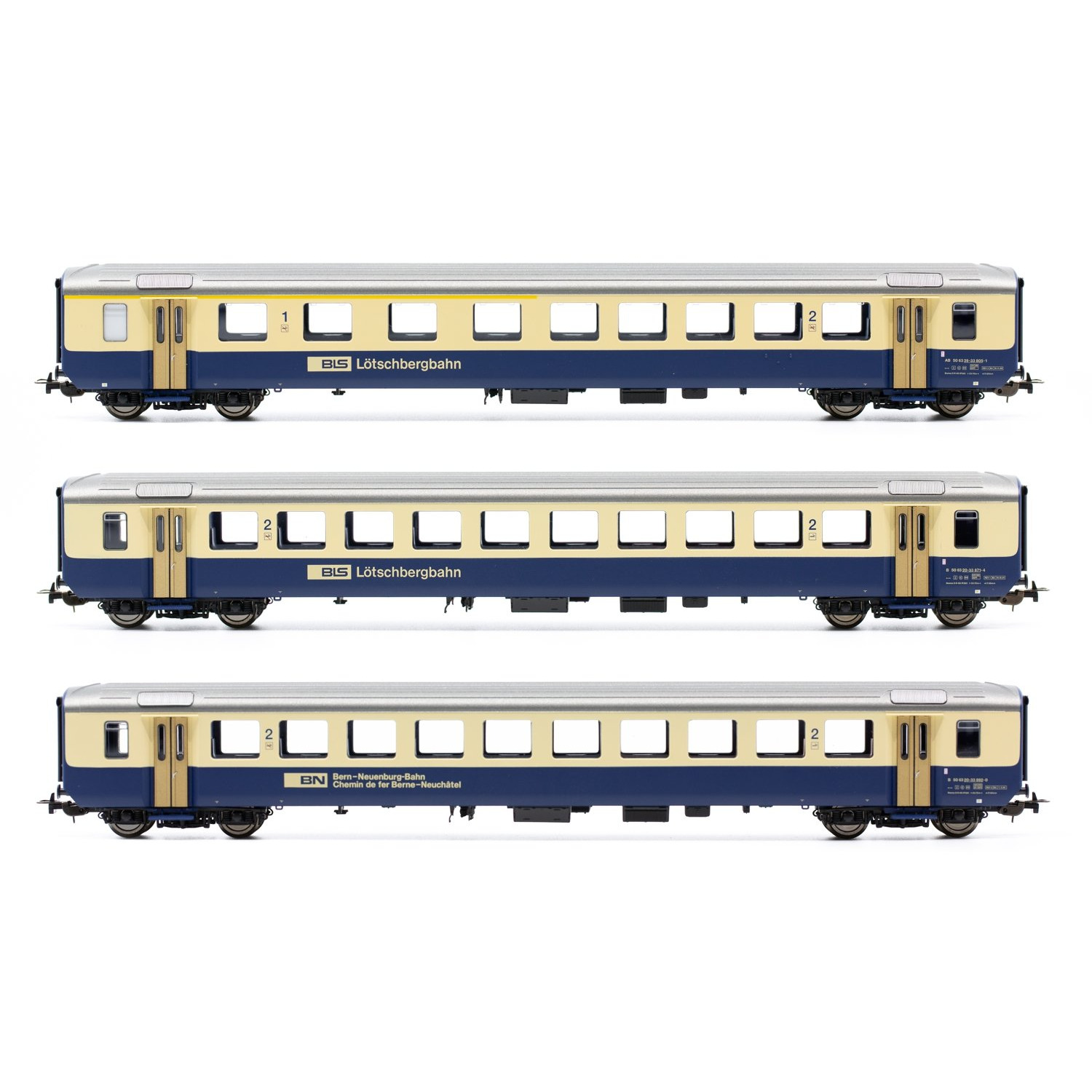BLS 2 x EW I AB+ B und 1 x BN B blau/beige - Diese Wagen verfügen serienmässig über WS-Achsen für das 3-L-Märklin-System