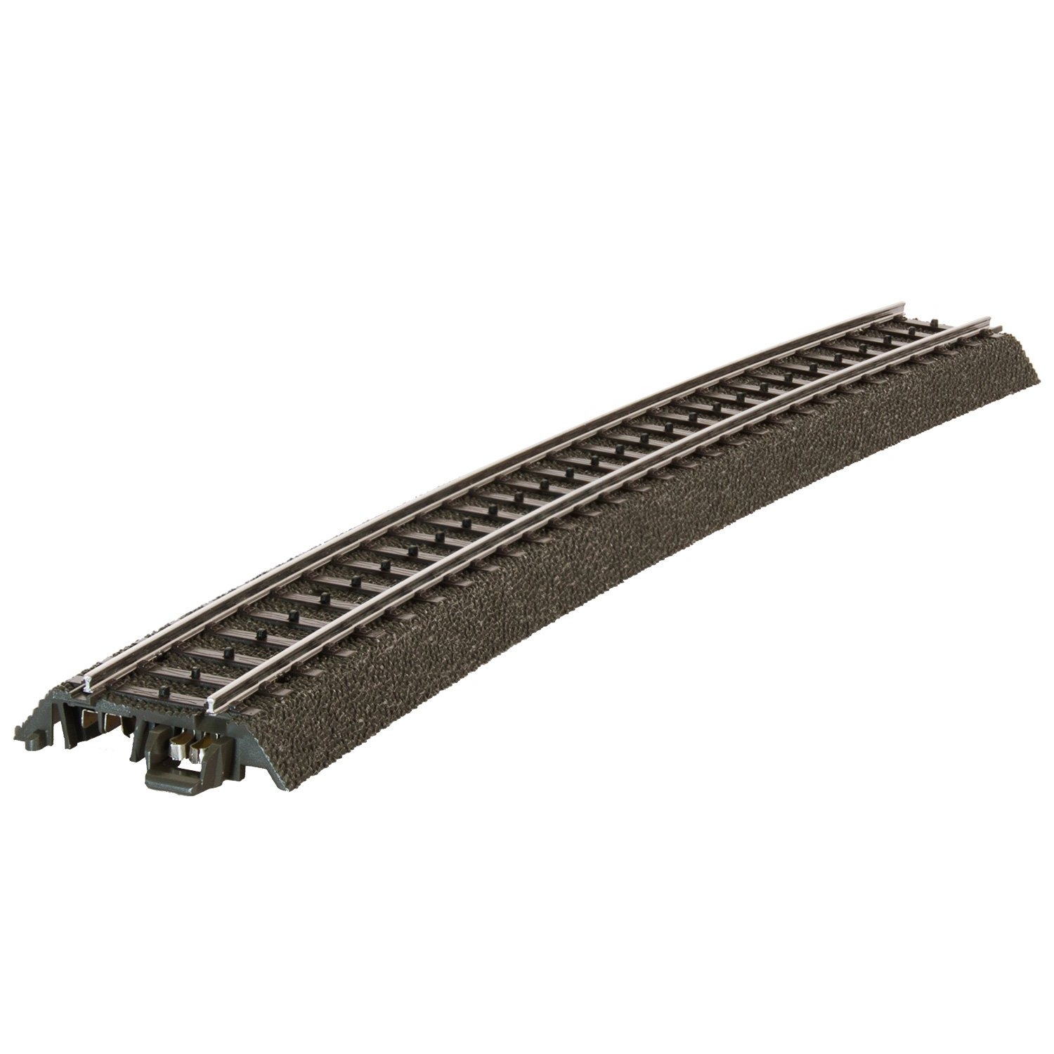 C-Gleis gebogen. Radius 1114,6 mm. Bogen 12,1-. Gegenbogen zur schlanken Weiche und Kreuzung. Auch zum Streckenbau geeignet.