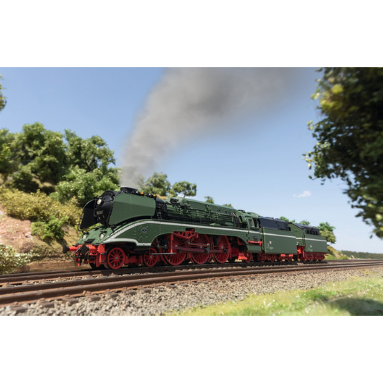 Vorbild: Schnellzug-Dampflokomotive 18 201 mit Öl-Hauptfeuerung und Zusatztender. Ehemalige Lokomotive der Deutschen Reichsbahn der DDR (DR/DDR), welche als Versuchslokomotive der VES-M Halle (Saale) aus Teilen der 61 002 und der H45 024 entstand. Betriebszustand um 2017, wie sie vor Sonderzügen eingesetzt wurde.