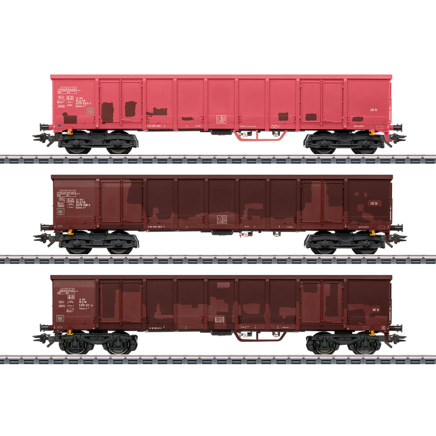 Vorbild: Set bestehend aus drei Hochbordwagen der Bauart Eanos-x 056 bzw. Eanos-x 052 der Deutschen Bahn AG. Unterschiedliche Grundfarbgebungen. Betriebszustand ab 2019.