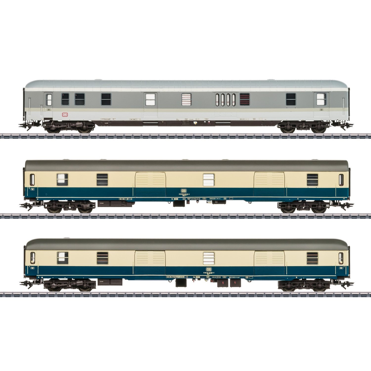 Vorbild: Drei Gepäckwagen unterschiedlicher Bauart der DB. Ein Gepäckwagen Dm 903 in Produktfarbgebung, ein Gepäckwagen Dms 905.0 mit Steildach in Ozeanblau/elfenbein und ein Gepäckwagen Dm 902 in Ozeanblau/elfenbein. Betriebszustand 1993.