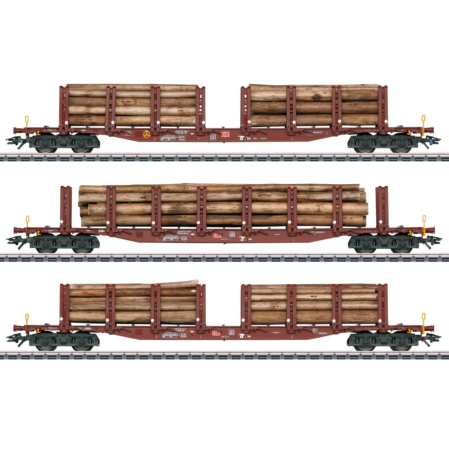 Modell: Fein detaillierte, feststehende Doppelrungen mit Spannhebeln. Farblich abgesetzte Ladefläche. Zwei Wagen mit je zwei Holzstapeln und ein Wagen mit einem langen Holzstapel beladen. Wagen einzeln verpackt. Gesamtlänge über Puffer ca. 72 cm.