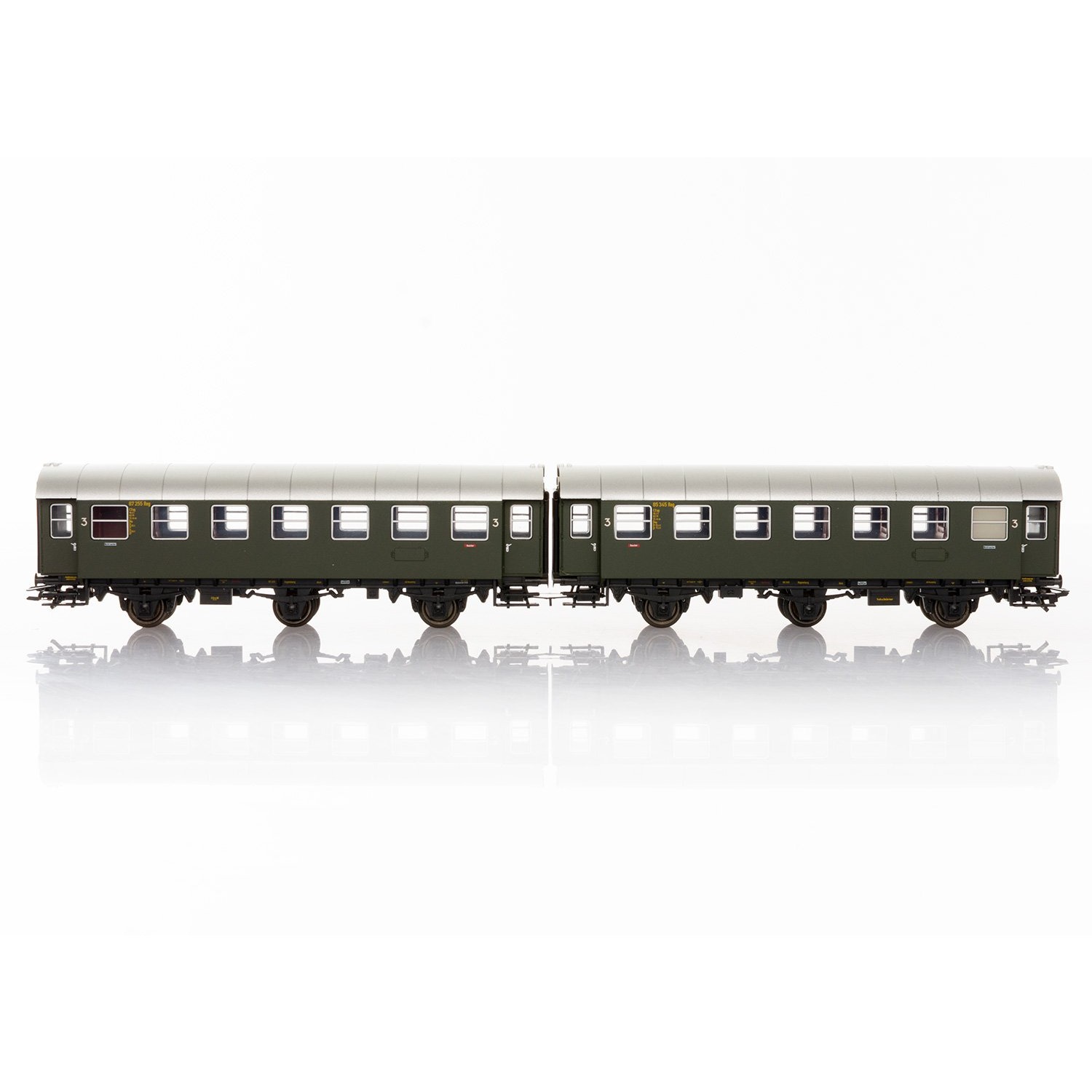 Vorbild: Umbauwagen BC3yg 2./3. Klasse und C3yg 3. Klasse mit je drei Radsätzen. Fest gekuppelter Doppelwagen. Flaschengrüne Farbgebung.