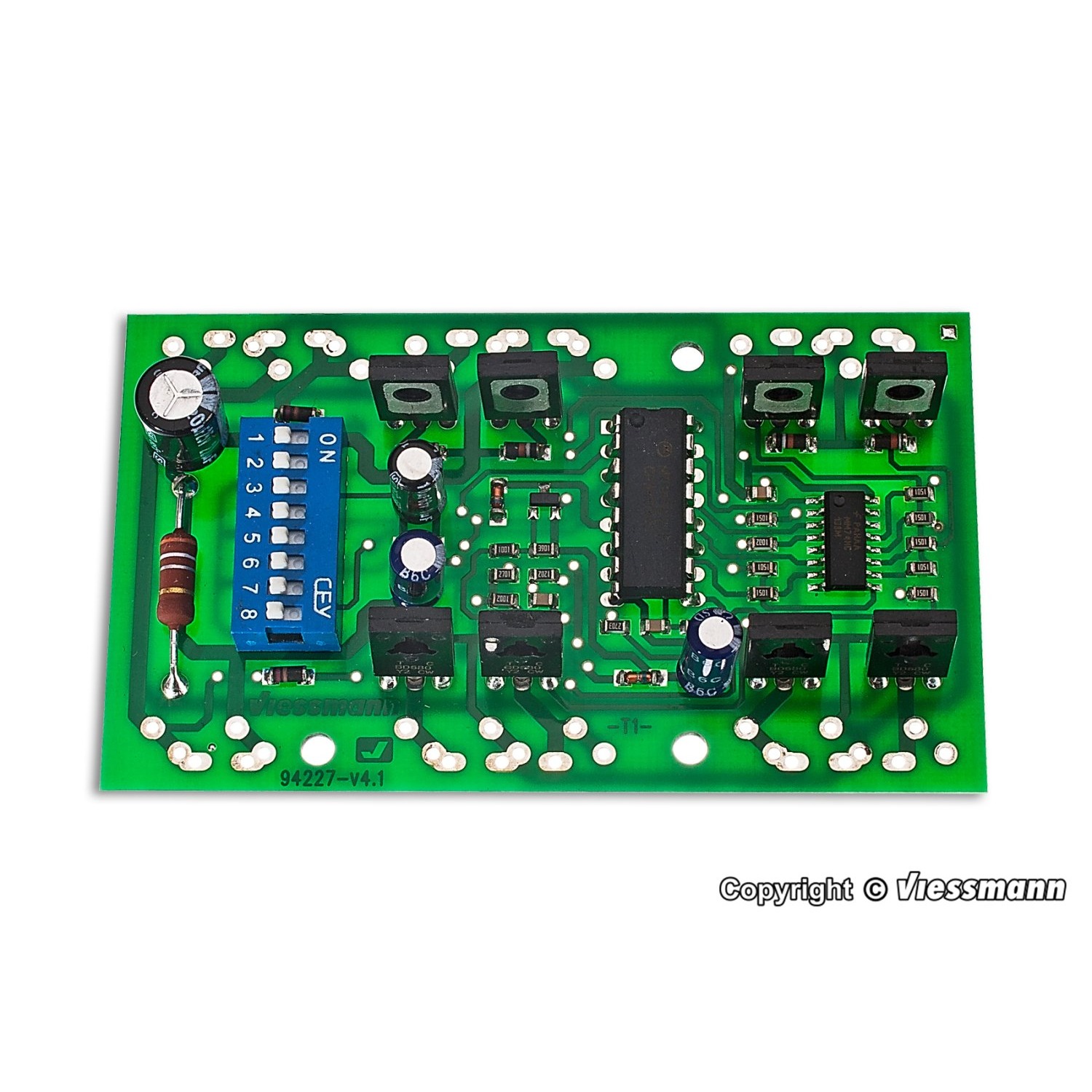 Funktionen wie beim Magnetartikeldecoder Art. 5211, jedoch ohne Gehäuse. Statt Anschlussbuchsen verfügt diese extrem preiswerte Version über Löt-Anschlussflächen. 8 Impulsausgänge zur Steuerung von 4 Magnetartikeln mit Doppelspulenantrieb. Der Codierschalter zum Einstellen von 80 möglichen Decoderadressen ist von aussen zugänglich. E-Buchse zur Einspeisung des Schaltstroms über einen separaten Trafo. Dies gewährleistet auch bei vielen gleichzeitig fahrenden Zügen ein sicheres Schalten der Weichen und Signale. Leistungsstarke Impulsausgänge mit bis zu 2 A belastbar. Mit Kurzschluss- und Überlastschutz. Positive Schaltimpulse. Kompatibel zu Märklin Central Stations.
