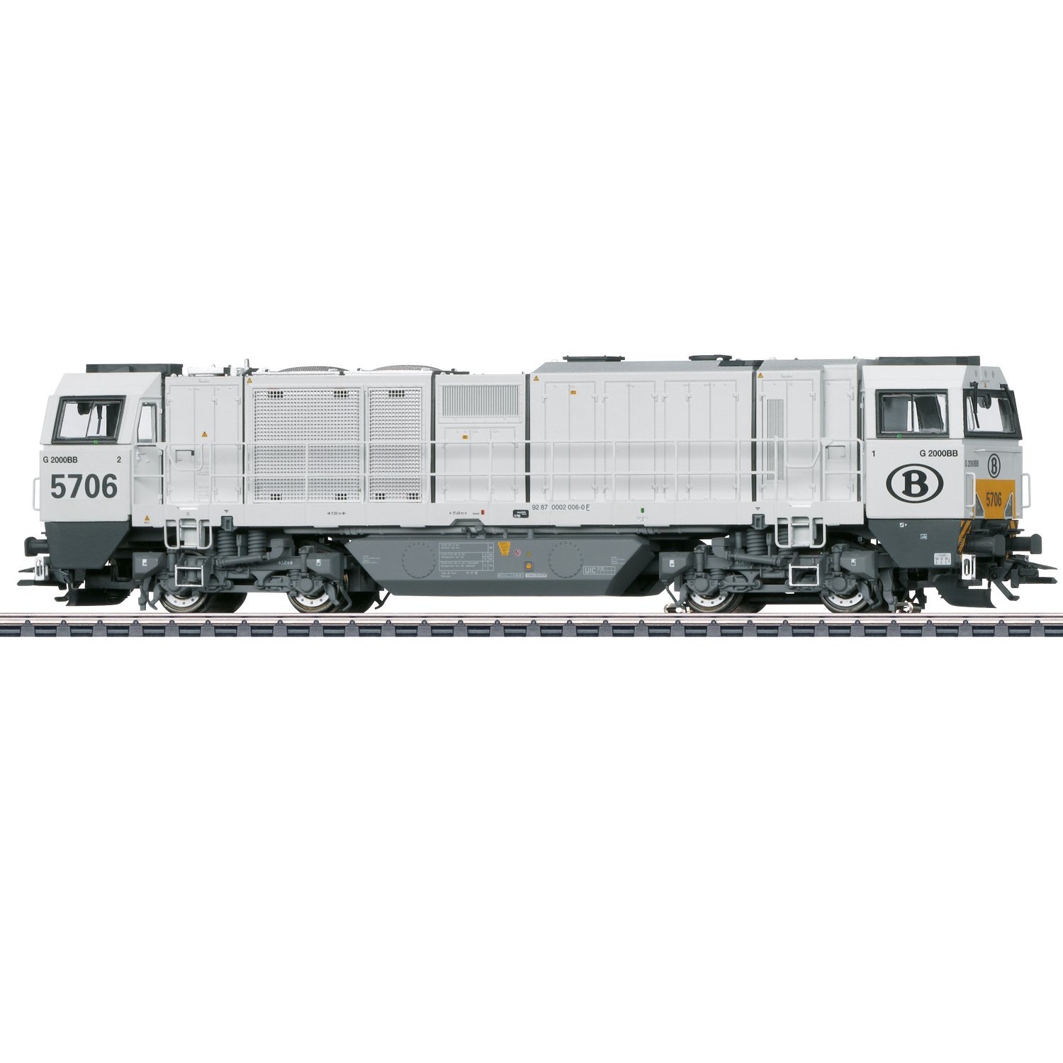 Vorbild: Schwere Diesellokomotive Vossloh G 2000 BB mit symmetrischem Führerhaus. Lokomotive der ATC AngelTrainsCargo, Antwerpen, als Serie 57 vermietet an die Belgischen Staatsbahnen (SNCB). Lichtgraue Grundfarbgebung mit basaltgrauem Rahmen. Lok-Betriebsnummer 5706. Betriebszustand der Epoche VI.Schwere Diesellokomotive der Baureihe G 2000.