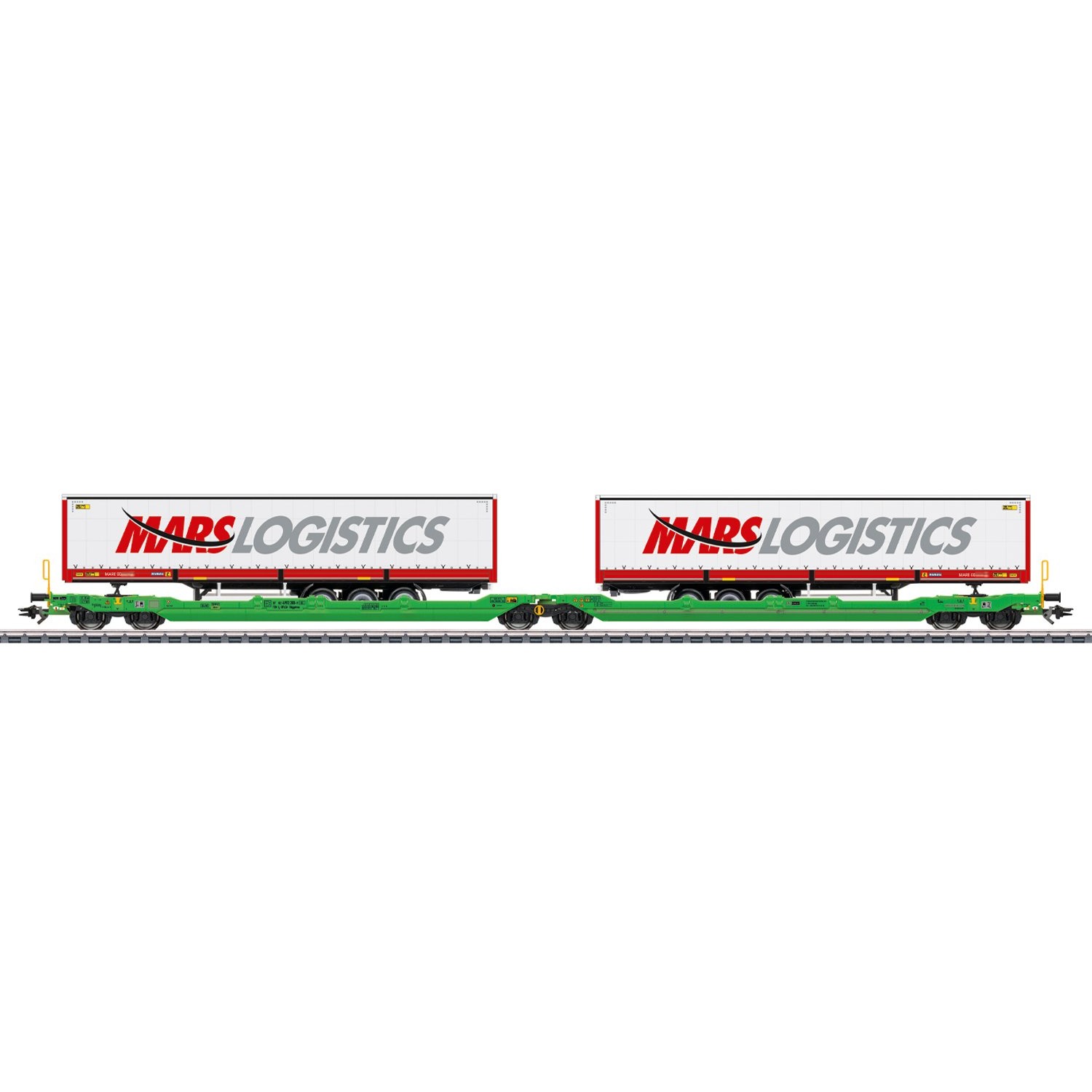 Vorbild: 6-achsiger Doppel-Taschenwagen mit Gelenk der Bauart Sdggmrss (T3000e) der CFL Cargo. Moderner Tragwagen für den kombinierten Ladungsverkehr. Reingrüne Grundfarbgebung. Ausführung mit vier seitlichen Klappriegeln. Betriebszustand ab 2021. Beladen mit zwei Gardinenplanen-Sattelaufliegern der Spedition Mars.
