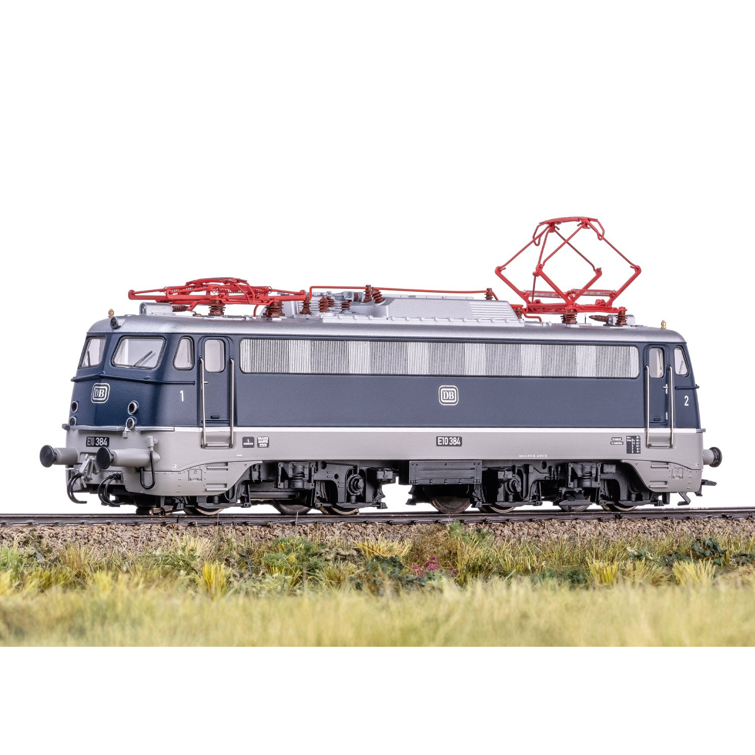 Vorbild: Elektrolokomotive Baureihe E10.3 der Deutschen Bundesbahn (DB). Lokkasten mit aerodynamischer Front, der sogenannten Bügelfalte, mit durchgehendem Lüfterband, umlaufender Regenrinne und stirnseitigen Griffstangen. Mit Pufferverkleidung und Schürze. Stahlblauer Lok-Aufbau mit steingrauem Rahmen. Lok-Betriebsnummer E10 384. Betriebszustand um 1967.