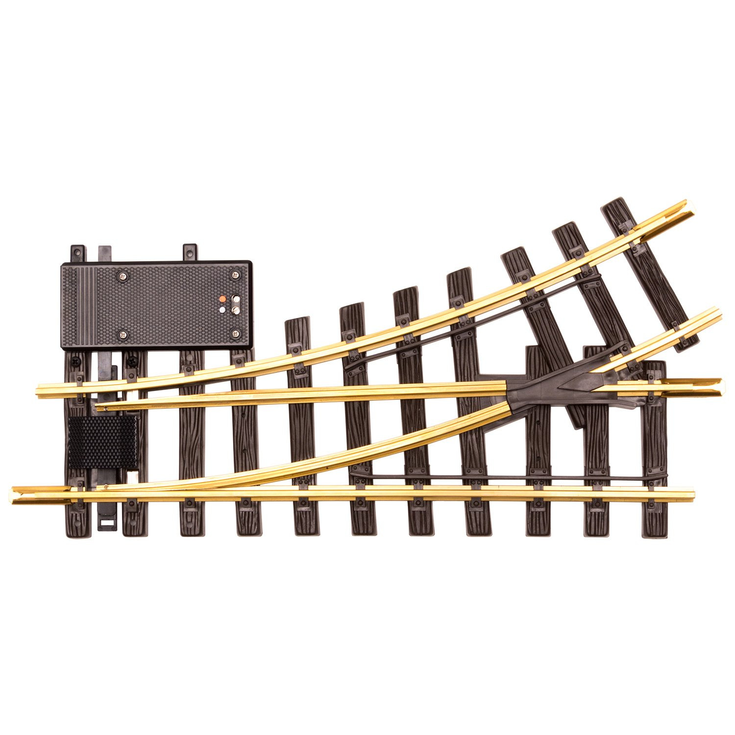 Gerades Gleis: 300 mm. Abzweigendes Gleis: links, R1. 30°. Der beiliegende Antrieb (LGB 12010) lässt sich rechts oder links an der Weiche montieren.