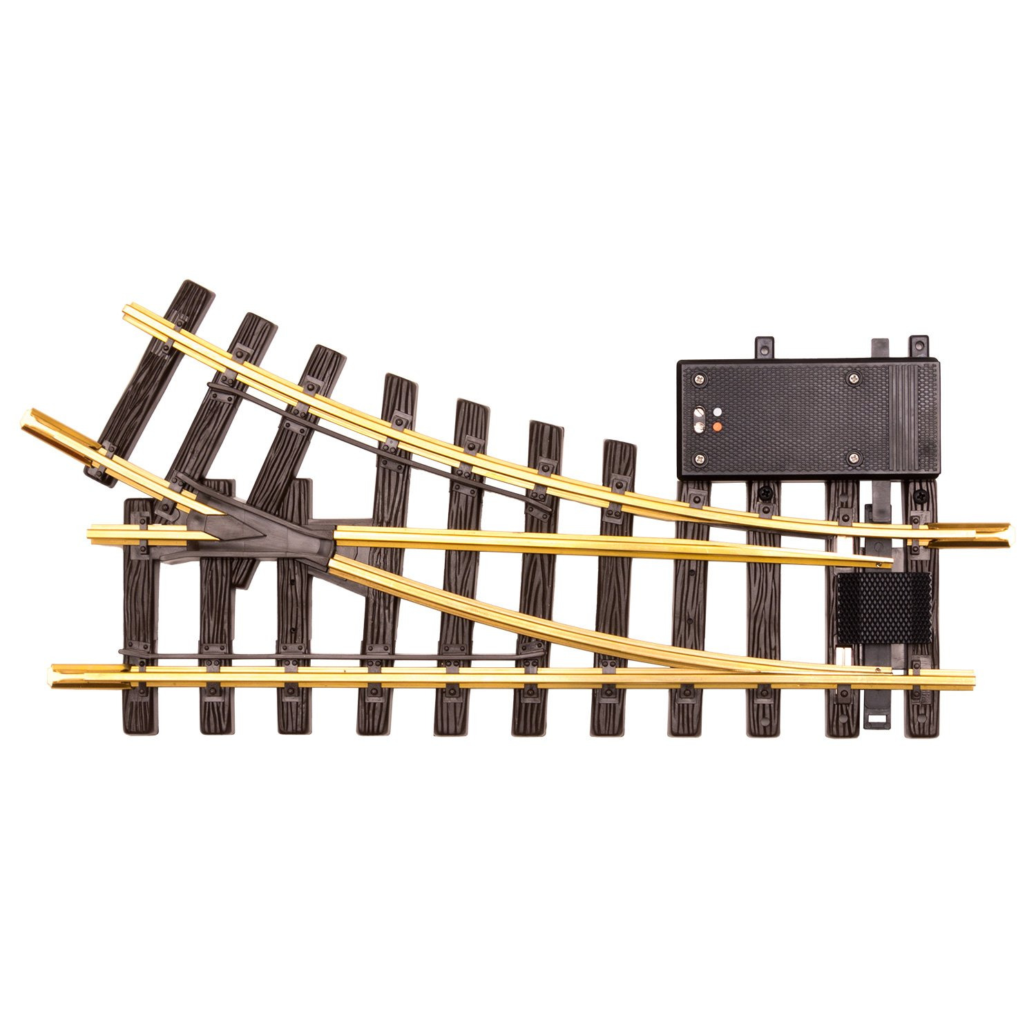 Gerades Gleis: 300 mm. Abzweigendes Gleis: rechts, R1, 30°. Der Antrieb (LGB 12010) lässt sich rechts oder links montieren.