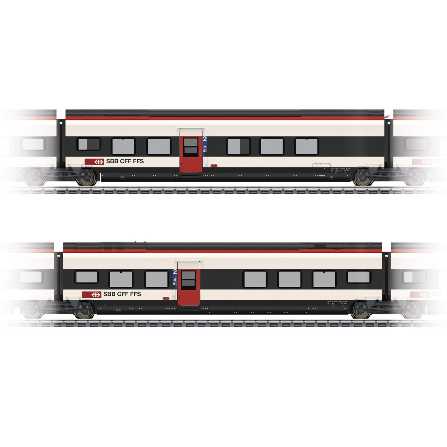 Vorbild: Ergänzungswagen für den Hochgeschwindigkeits-Triebzug RABe 501 "Giruno" der Schweizerischen Bundesbahnen (SBB). 1 Mittelwagen D (B9), 2. Klasse, mit Pantograph. 1 Mittelwagen E (B8), 2. Klasse. Aktueller Betriebszustand 2021.