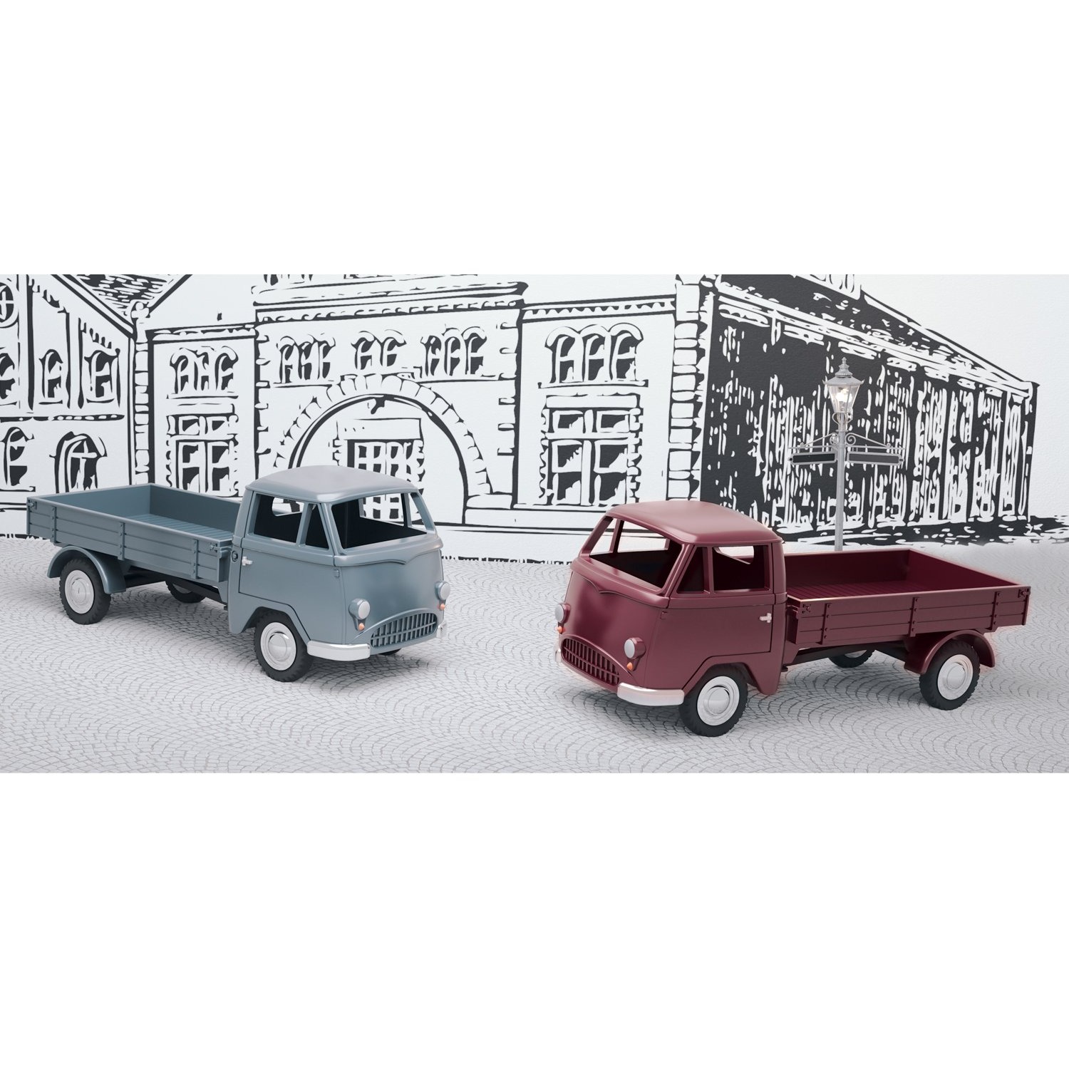 Modell: Je ein Fahrzeug Tempo Hochlader in Rubinroter und in Taubenblauer Farbgebung. Re-Make des früheren Modells 8026. Fahrzeug-Aufbau Zinkdruckguss. Metallräder bestückt mit Gummireifen. Baugröße ca. 1:45. Fahrzeuglänge jeweils ca. 9,1 cm. Das Fahrzeug-Set Tempo-Hochlader wurde in einer einmaligen Serie nur im Jahr 2021 gefertigt.