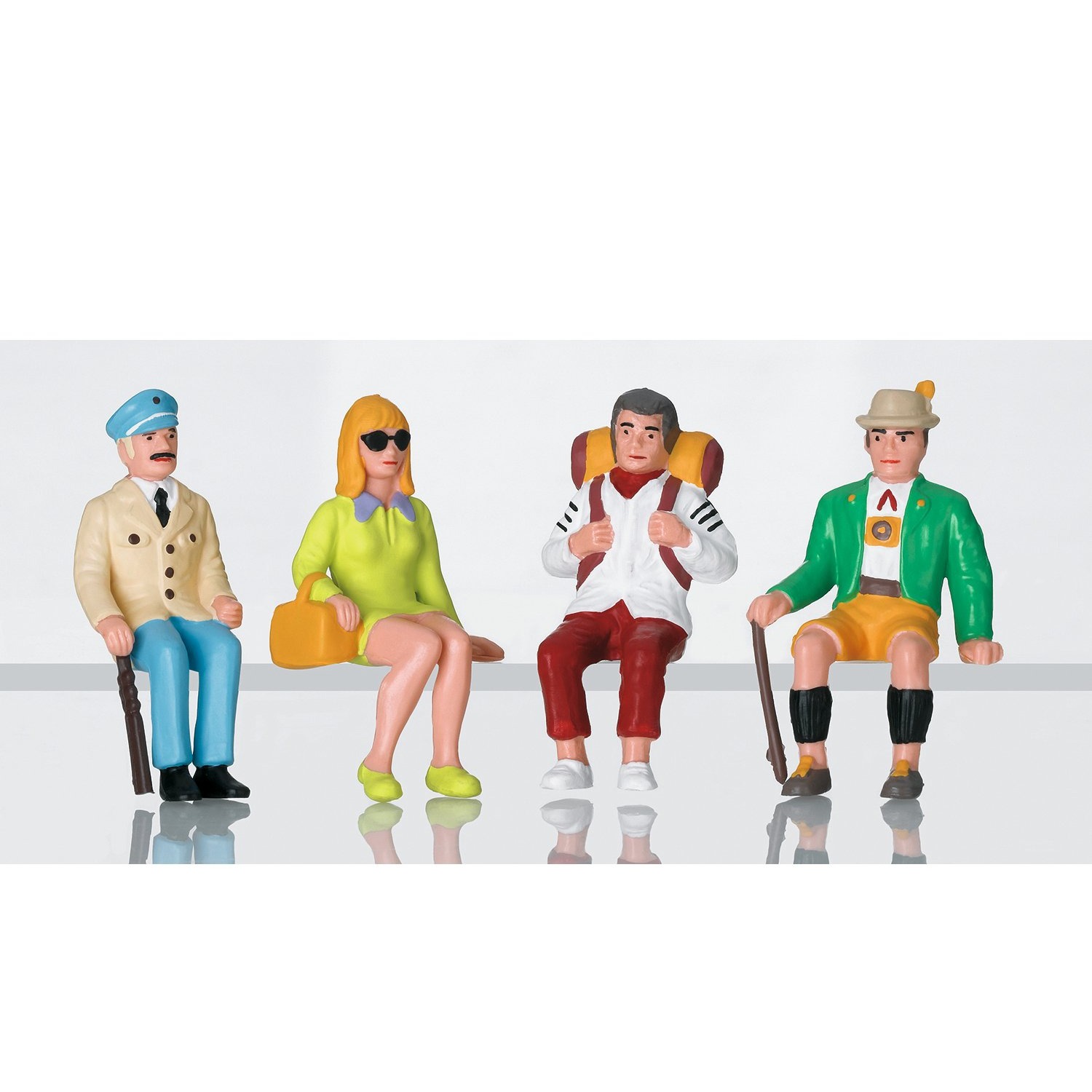 Set bestehend aus vier Figuren (sitzende Touristen), die als Reisende auf dem Bahnsteig oder auch zur vielfältigen Ausschmückung der Anlage verwendet werden können. Bänke liegen nicht bei.