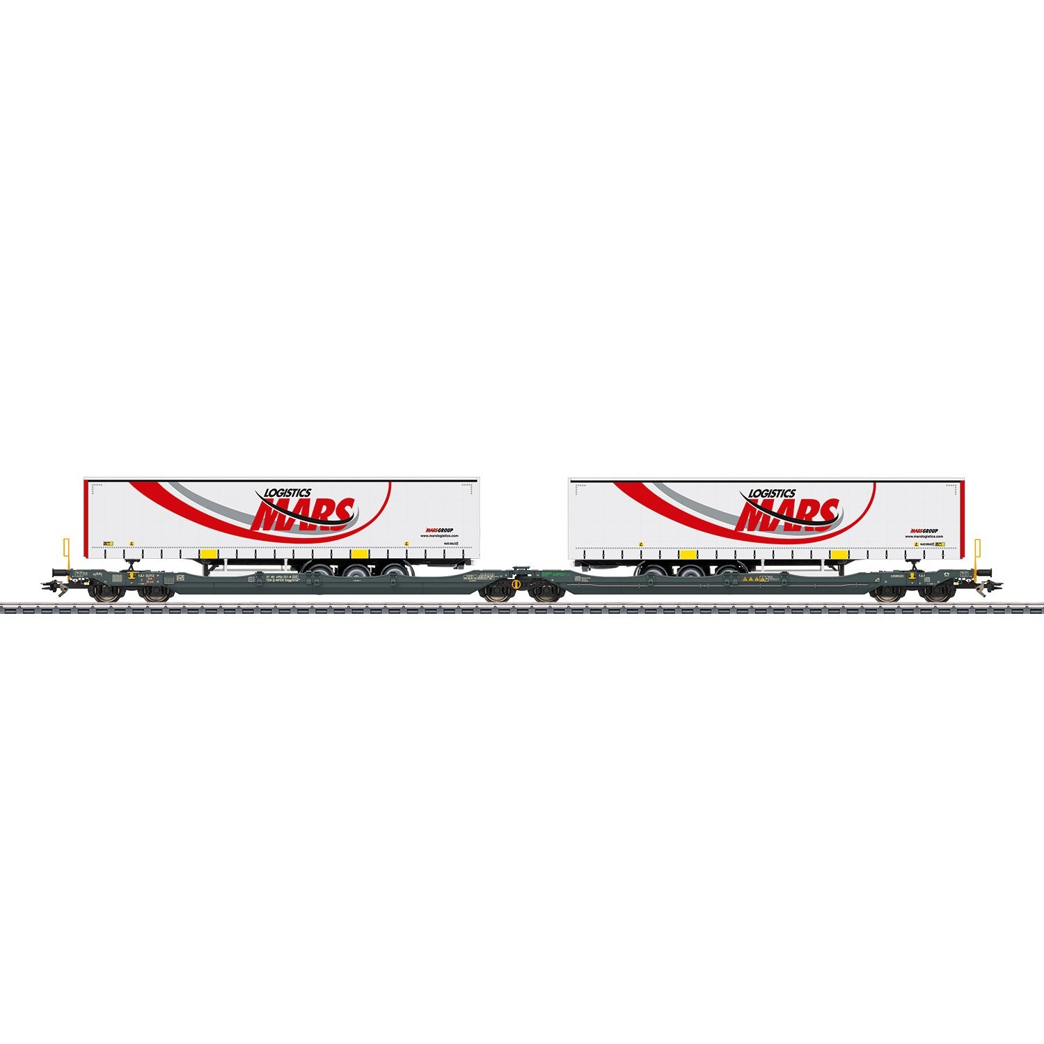 Vorbild: 6-achsiger Doppel-Taschenwagen mit Gelenk der Bauart Sdggmrss mit geschwungenen Seitenflächen der MFD Rail GmbH. Moderner Tragwagen für den kombinierten Ladungsverkehr. Granitgraue Grundfarbgebung. Ausführung mit vier seitlichen Klappriegeln. Betriebszustand ab 2021. Beladen mit zwei Gardinenplanen-Sattelaufliegern der Spedition Mars.