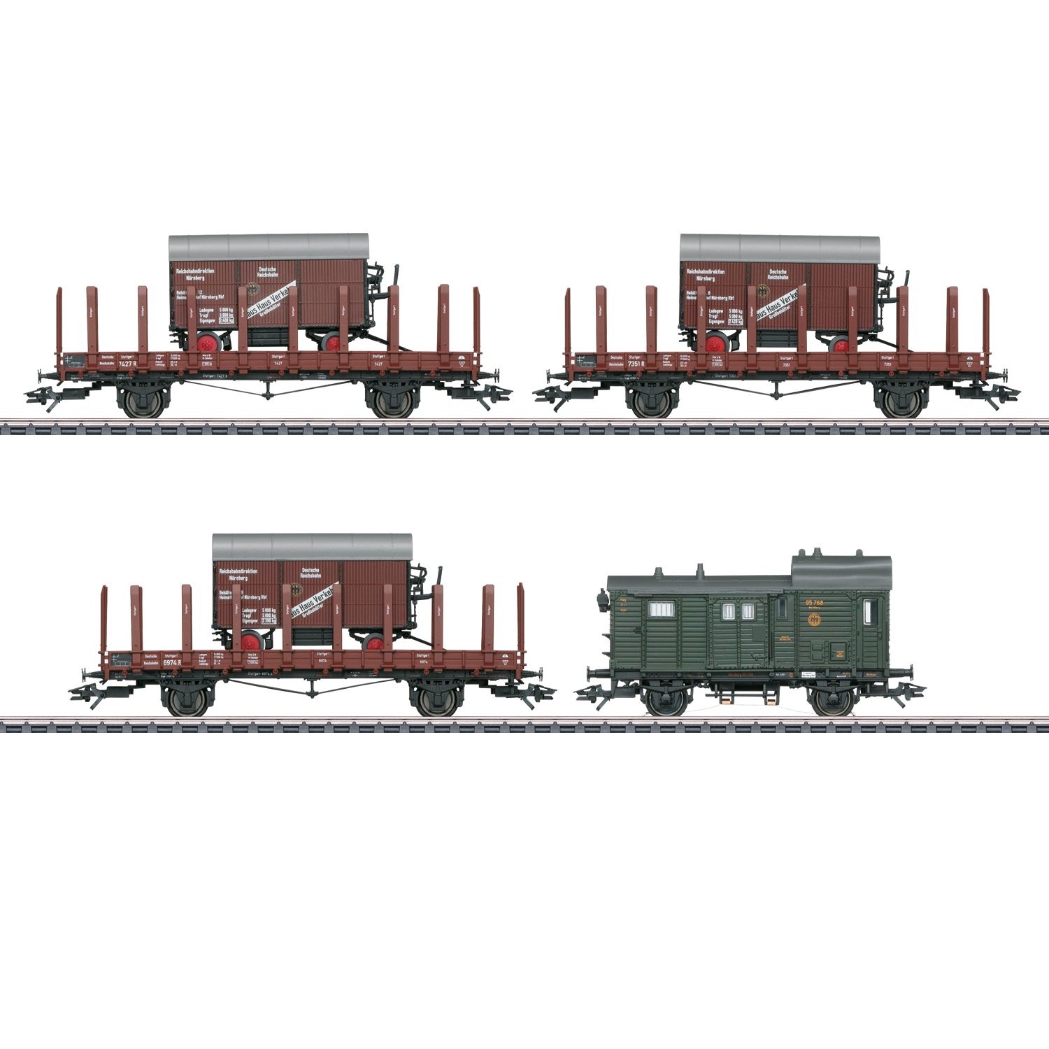 Modell: Rungenwagen mit Sprengwerk. Alle Rungenwagen jeweils beladen mit einem Großbehälter mit Straßenlaufwerk. Einsteckbare Rungen liegen bei. Güterzug-Gepäckwagen mit Dachaufsatz, neuer LED Schlussbeleuchtung und montiertem Schleifer. Großbehälter mit unterschiedlichen Betriebsnummern. Gesamtlänge über Puffer ca. 51,5 cm.