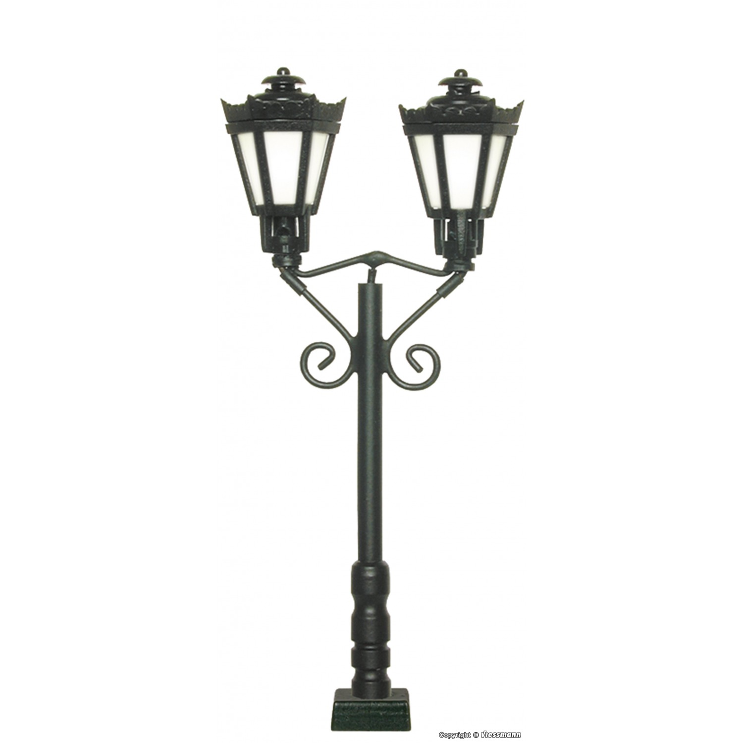 H0 Parklaterne zweiflammig, schwarz mit Kontaktstecksockel und LED, Höhe 56 mm.