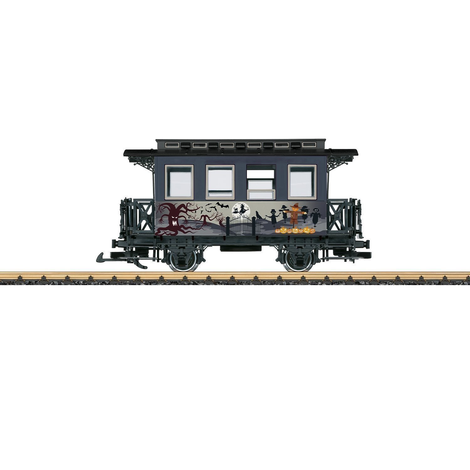 Modell eines zweiachsigen Personenwagens in der Gestaltung passend zu Halloween. Türen zum Öffnen, Metall-Scheibenradsätze. Länge über Puffer 30 cm.