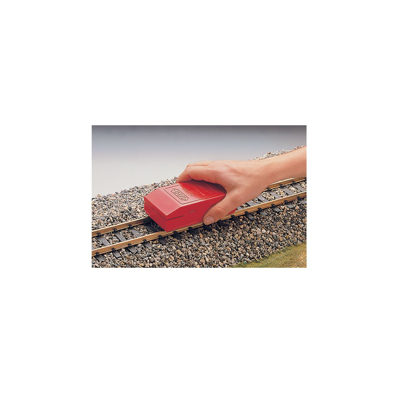 Eine preisgünstige Methode, Ihre Schienen einfach und schonend zu reinigen. Der Handschleifer entfernt Schmutz von den Schienen, ohne diese abzuschleifen. Der 6 mm dicke Reinigungsblock hat eine lange Lebensdauer. Nicht für Nickel-Gleise geeignet