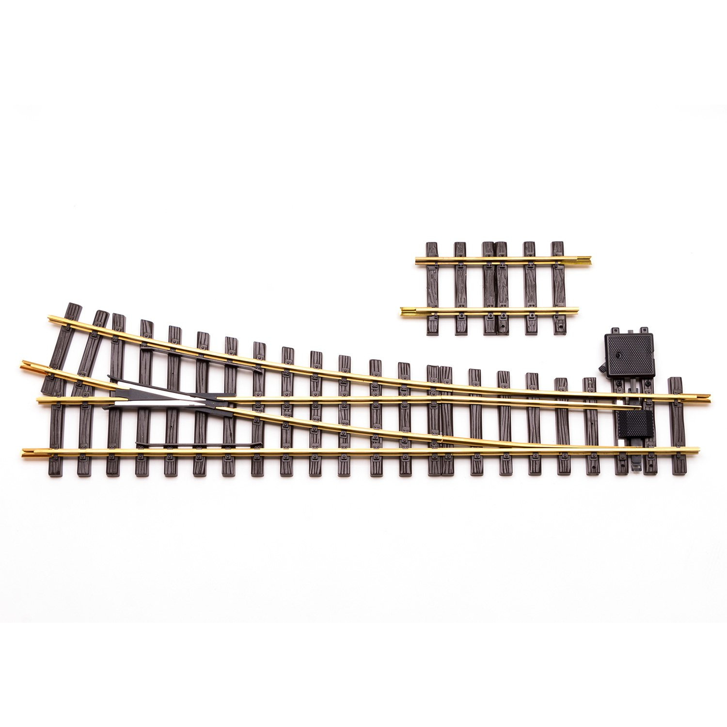 Gerades Gleis: 600 mm. Abzweigendes Gleis: rechts, R5, 15°. Der Handweichenantrieb lässt sich links oder rechts an der Weiche montieren. Nachrüstbar mit dem elektrischen LGB-Weichenantrieb (LGB 12010).