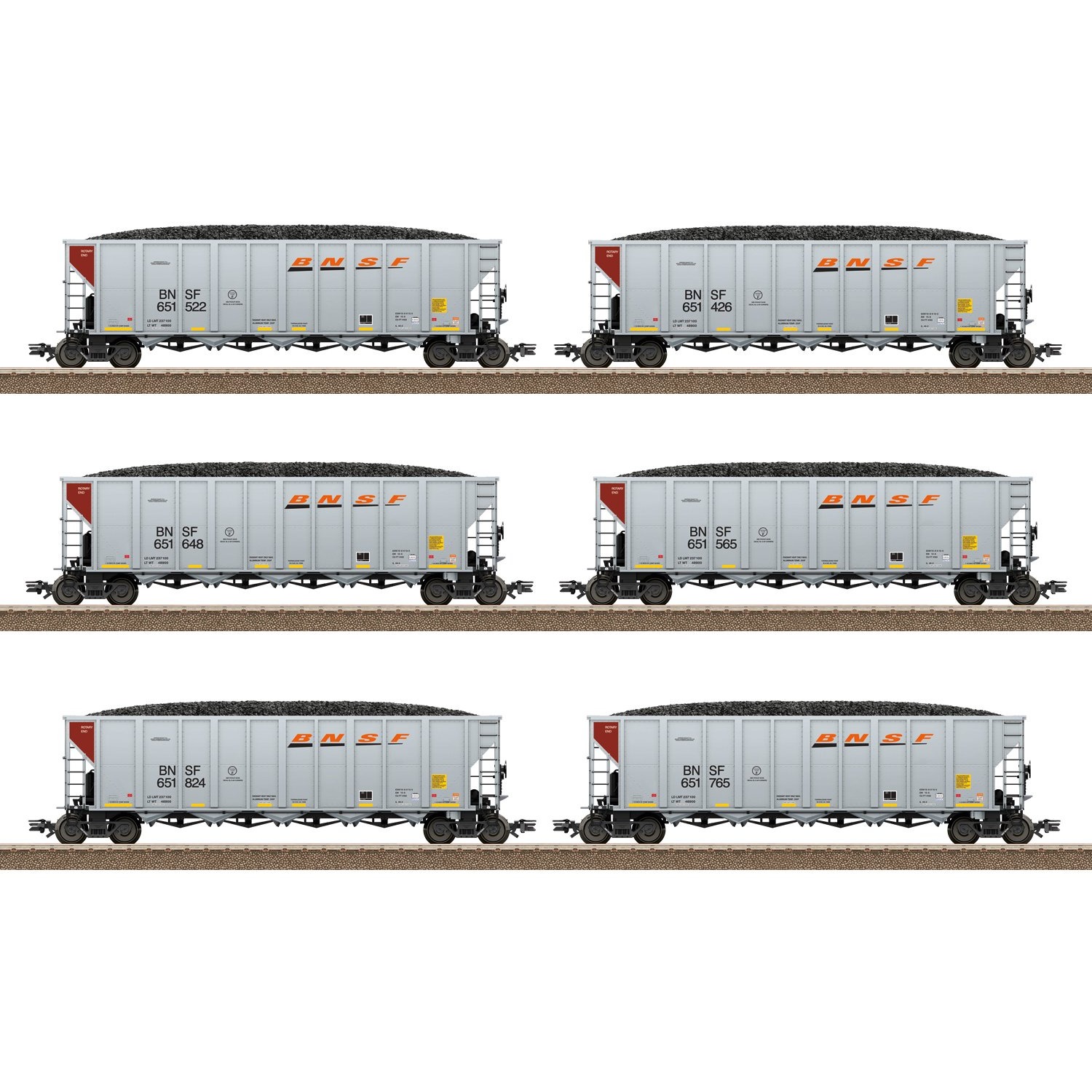 Vorbild: Sechs Kohletransportwagen, sogenannte Hopper Cars, der Burlington Northern Santa Fe, LLC (BNSF). Ausführung mit fünf Entladeeinrichtungen am Wagenboden. Aktueller Betriebszustand.