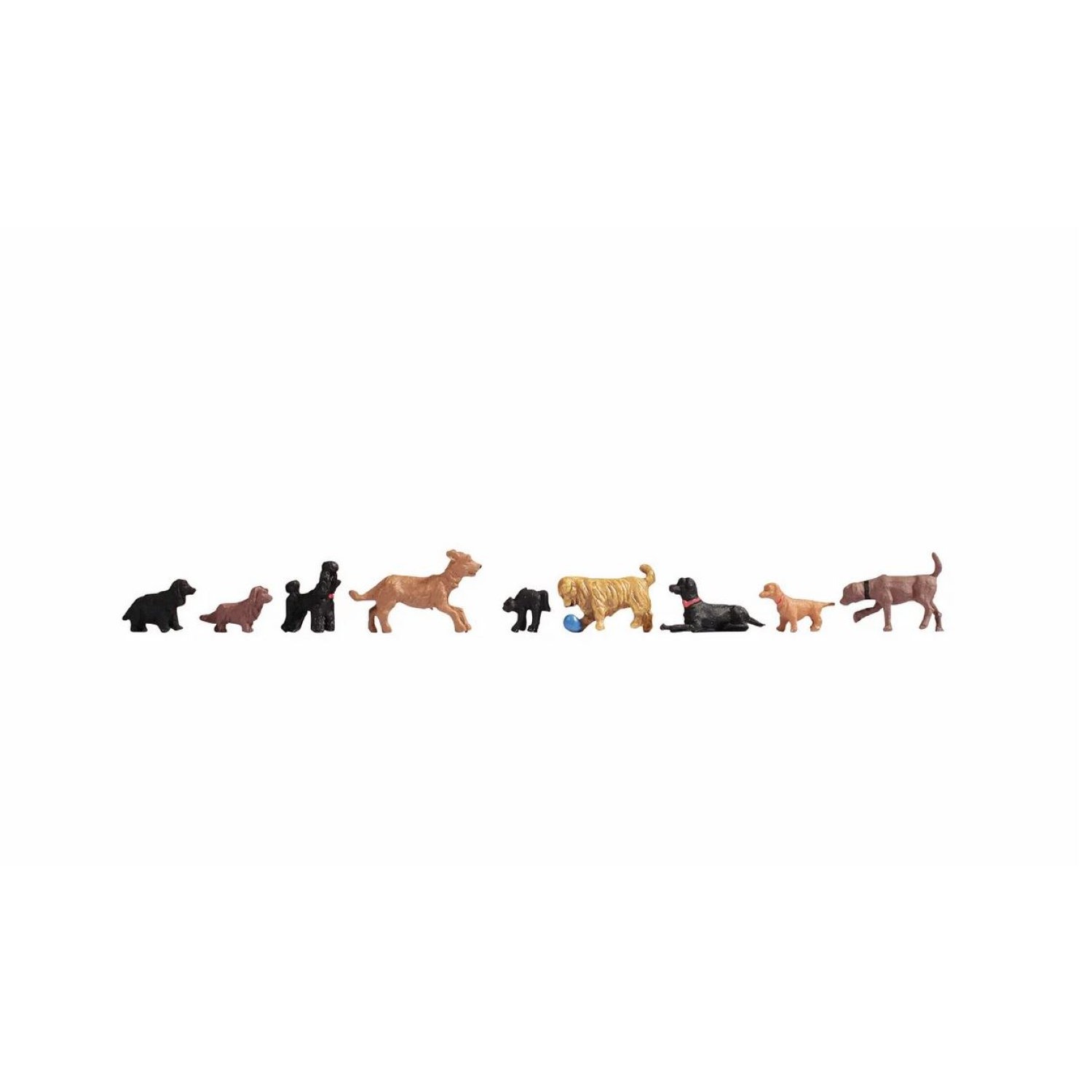 Vier der Hunde sind schwarz und die restlichen weisen verschiedene Brauntöne auf. Ein hellbrauner Hund spielt mit einem blauen Ball. Die Modellfiguren sind ideal zur Ausgestaltung von Dioramen geeignet.