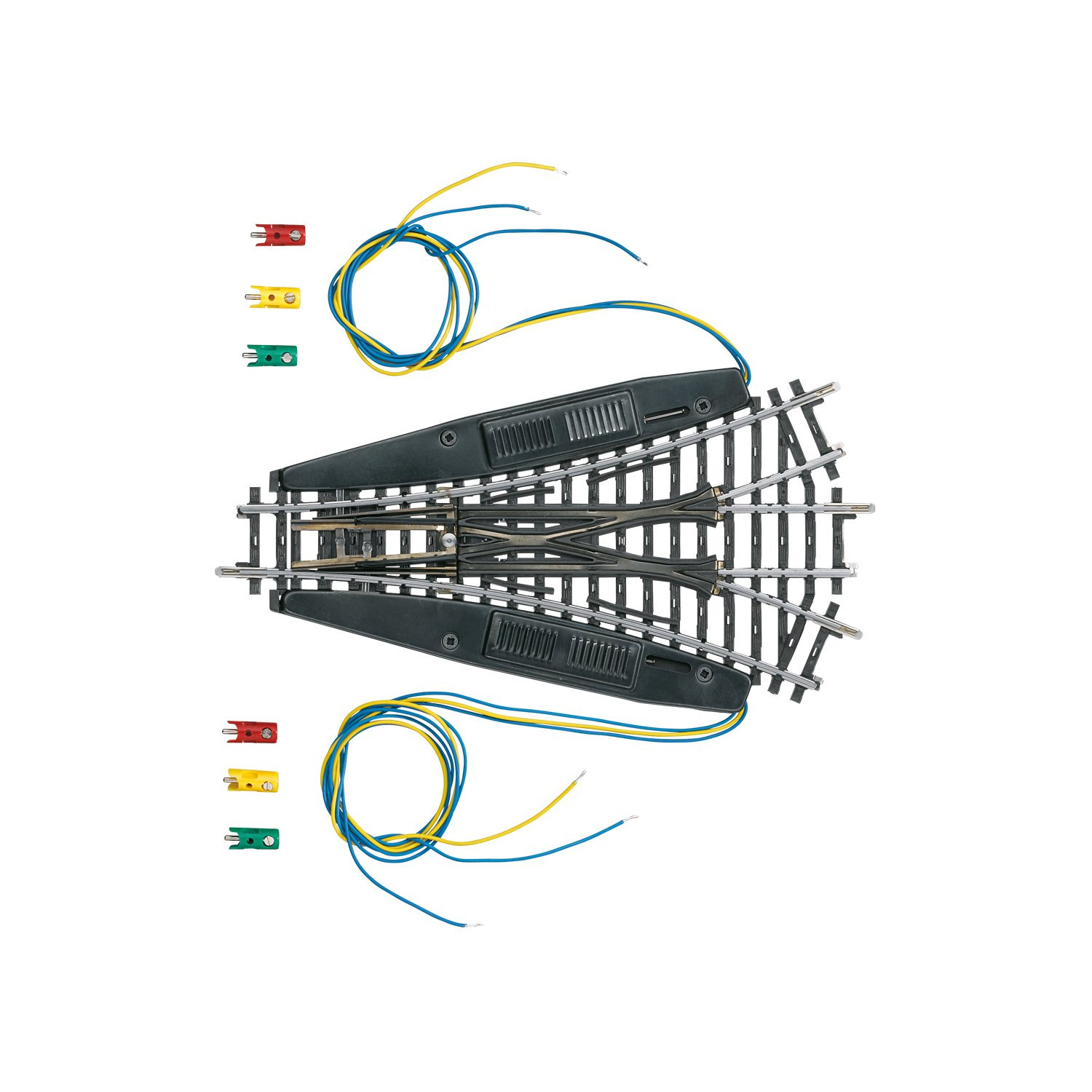 Mit 2 elektromagnetischen Antrieben. Länge des geraden Gleises 168,9 mm. Weichenbögen 2 x 22° 30’. Radius Zweiggleis 424,6 mm. Bogen entspricht 2232. 2 zusätzliche Handschalthebel. 6 Anschlusskabel.