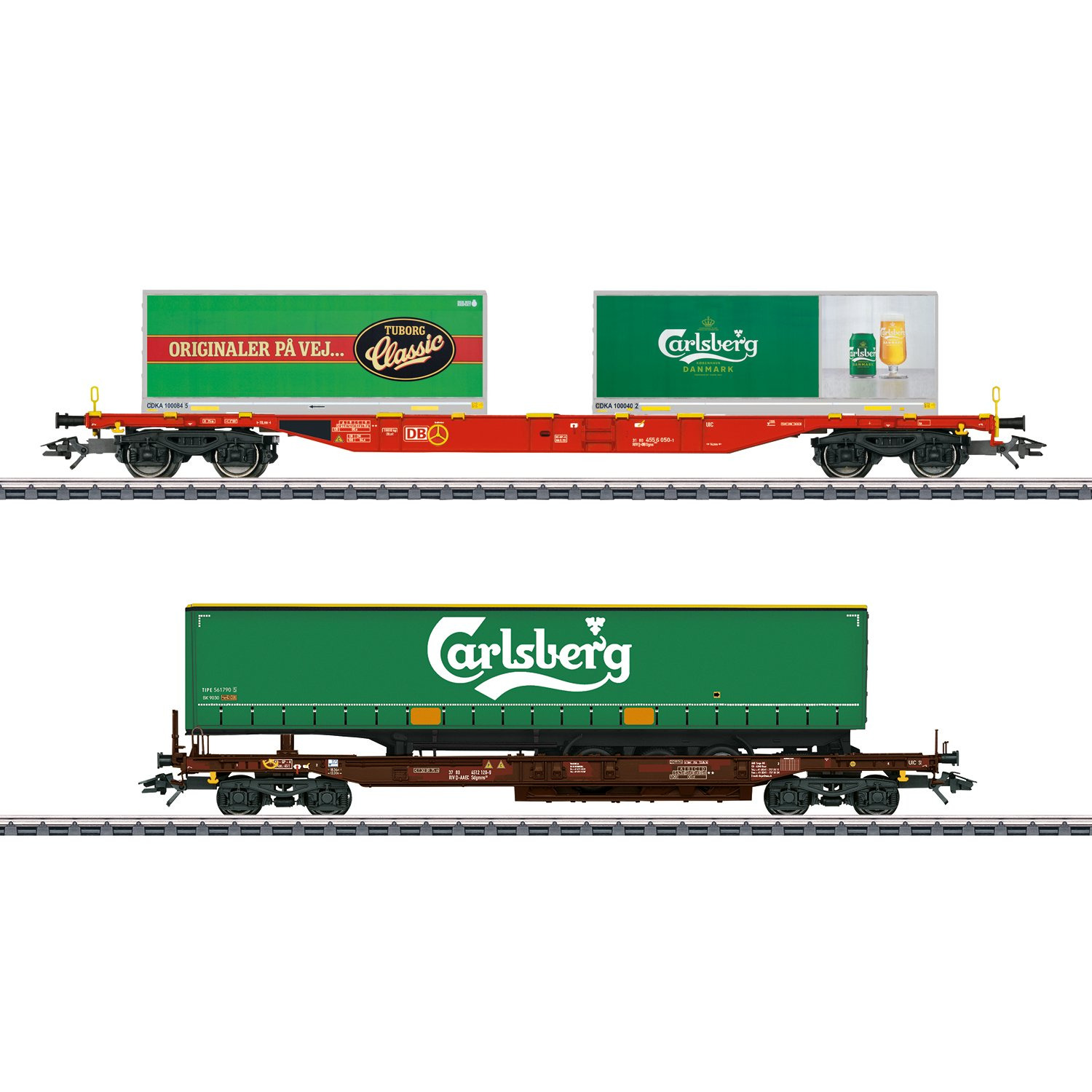Vorbild: Ein vierachsiger Taschenwagen der AAE Cargo AG. Bauart Sdgmns zum Transport von Containern, LKW-Wechselaufbauten oder Sattelanhängern. Beladen mit einem Gardinenplane-Sattelauflieger von Carlsberg. Ein vierachsiger Containertragwagen Sgns deDB AG. Beladen mit 2 Wechselbrücken von Carlsberg und Tuborg. Aktueller Betriebszustand.