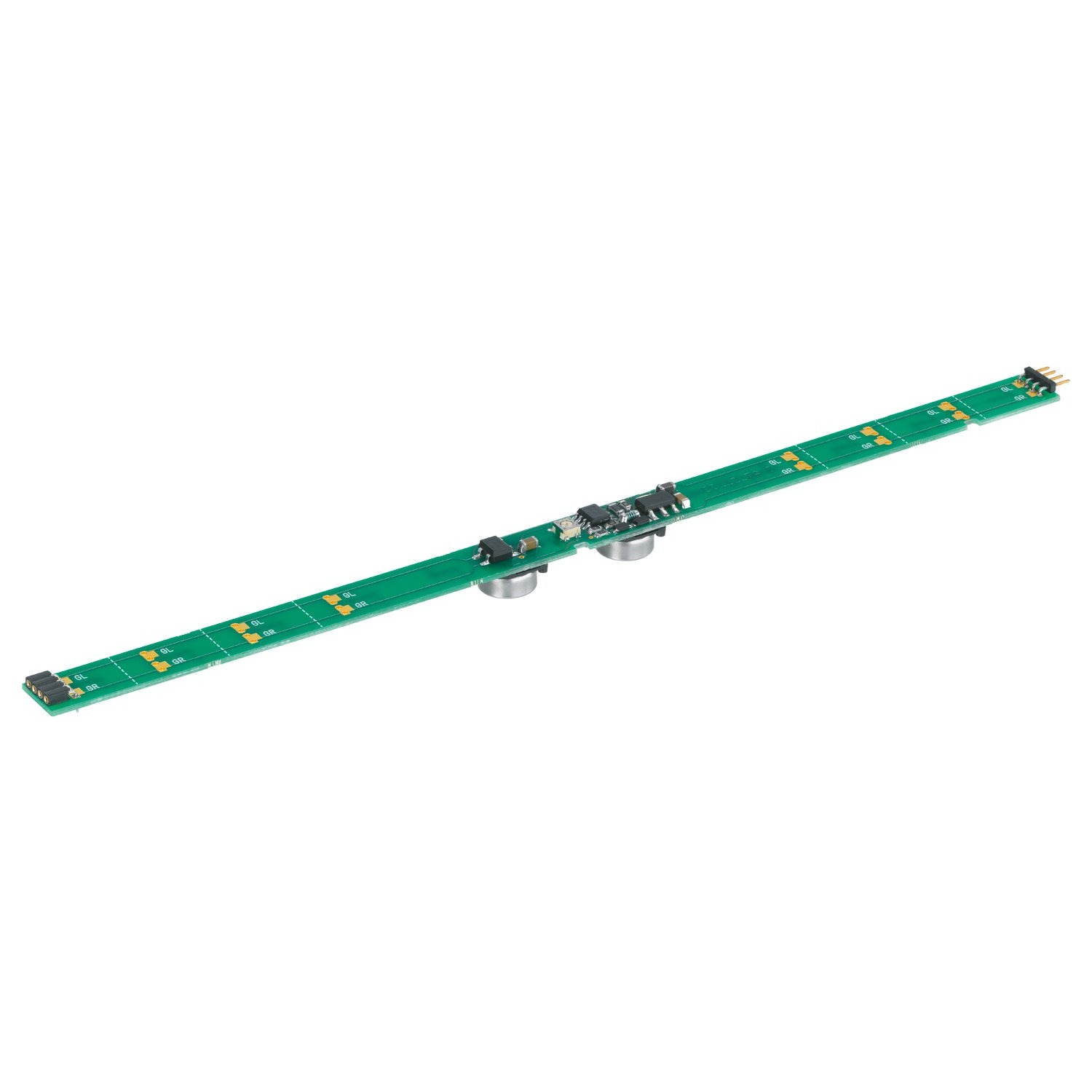 Universal-Platine mit mehreren Leuchtdioden zur Nachrüstung der meisten Personenwagen im Märklin H0-Sortiment. Eingebauter Pufferspeicher ermöglicht einen flackerfreien Betrieb. Helligkeit der Innenbeleuchtung manuell einstellbar. Für kürzere Wagen kann die Platine an mehreren Stellen gekürzt werden. Haltebügel zur Befestigung auf der Inneneinrichtung liegen bei.