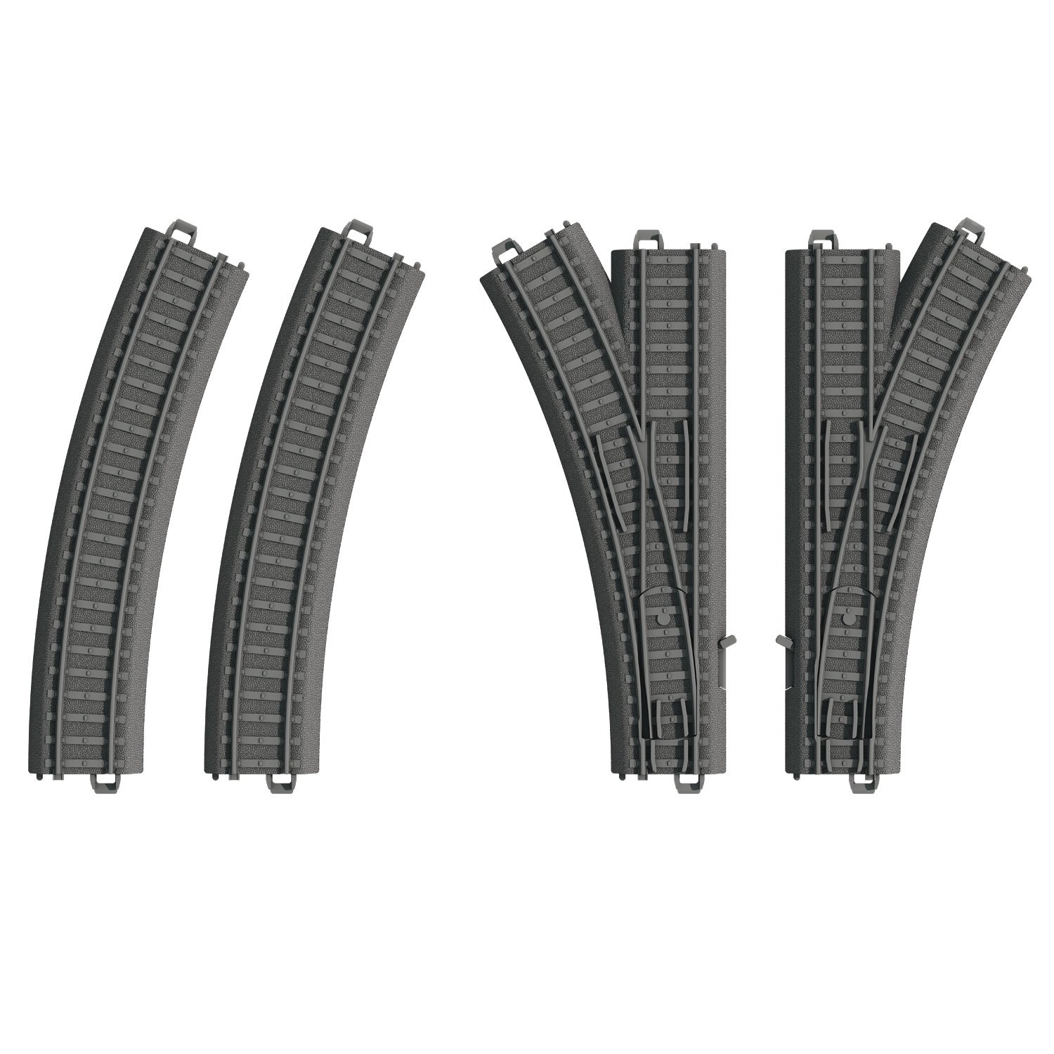 Inhalt: 1 Weiche links, 1 Weiche rechts und 2 gebogenen Gleise aus stabilem, kindgerechten Kunststoff gefertigt.