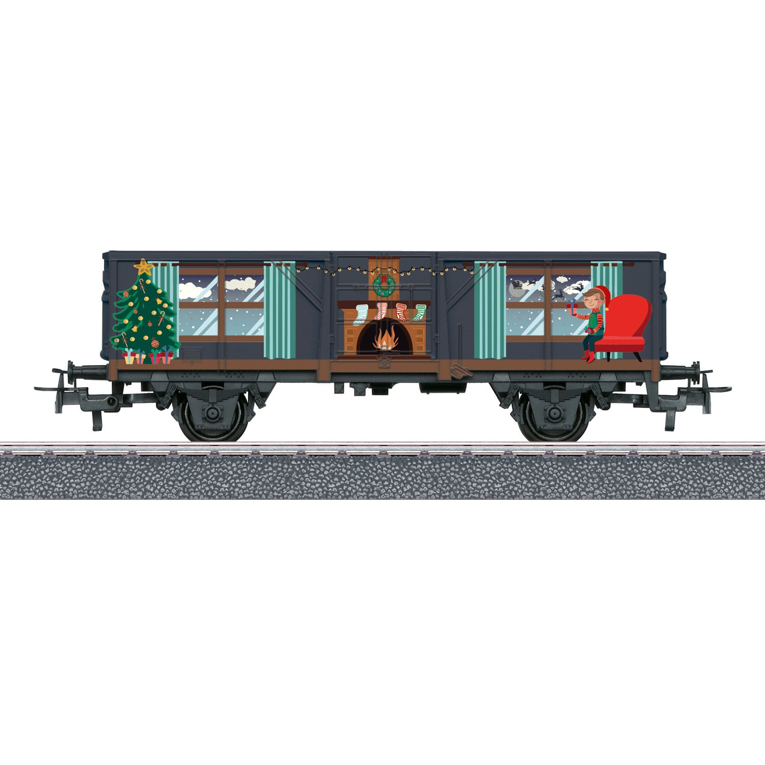 Modell: Offener Güterwagen in Weihnachtsgestaltung. Der Wagen ist mit einem batteriebetriebenen Lichtmodul beladen. Das Lichtmodul ist als beleuchtete Geschenke-Beladung gestaltet. Relex-Kupplungen. Batterien im Lieferumfang enthalten. Wagenlänge 11,5 cm.