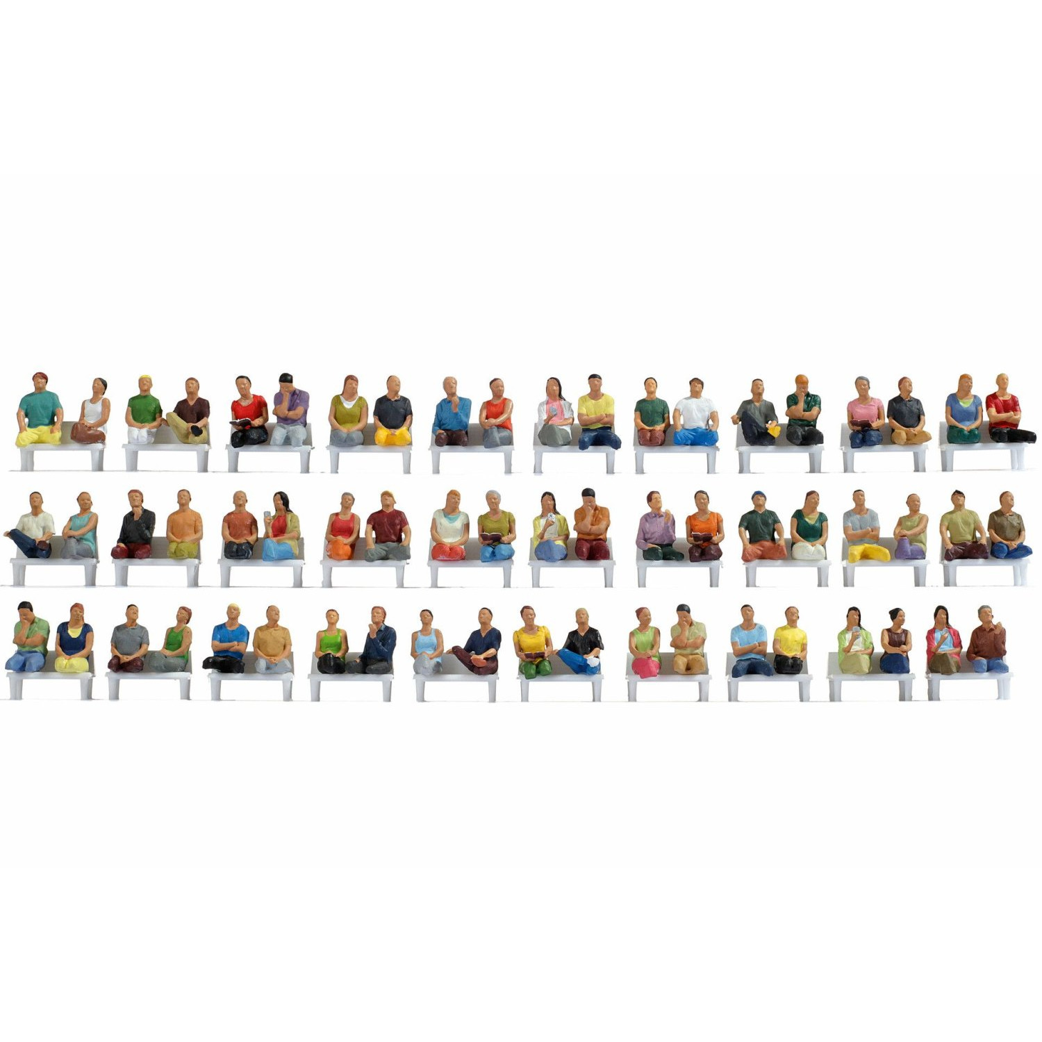 Viele Personenwagen-Inneneinrichtungen sind technisch bedingt mit niedrigen Sitzen ausgestattet. Oft muss man den Figuren daher die Beine entfernen bevor man sie auf die Sitze kleben kann. Noch bequemer geht es mit der neuen Grosspackung, die gleich 60 handbemalte sitzende Figuren ohne Beine (und ohne Bänke) enthält.
