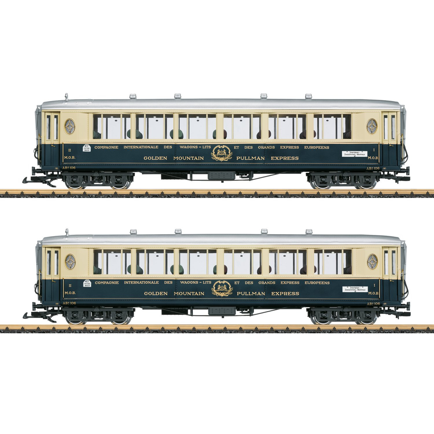 Personenwagen-Set bestehend aus zwei Wagen des "Golden Mountain Pullman Express" der CIWL, wie sie bei der MOB in den 30er-Jahren im Einsatz waren. Originalgetreue Farbgebung und Beschriftung der Epoche II. Detaillierte Inneneinrichtung, Innenbeleuchtung serienmässig eingebaut. Türen zum Öffnen. Metallradsätze. Länge über Puffer je Wagen 66 cm.
