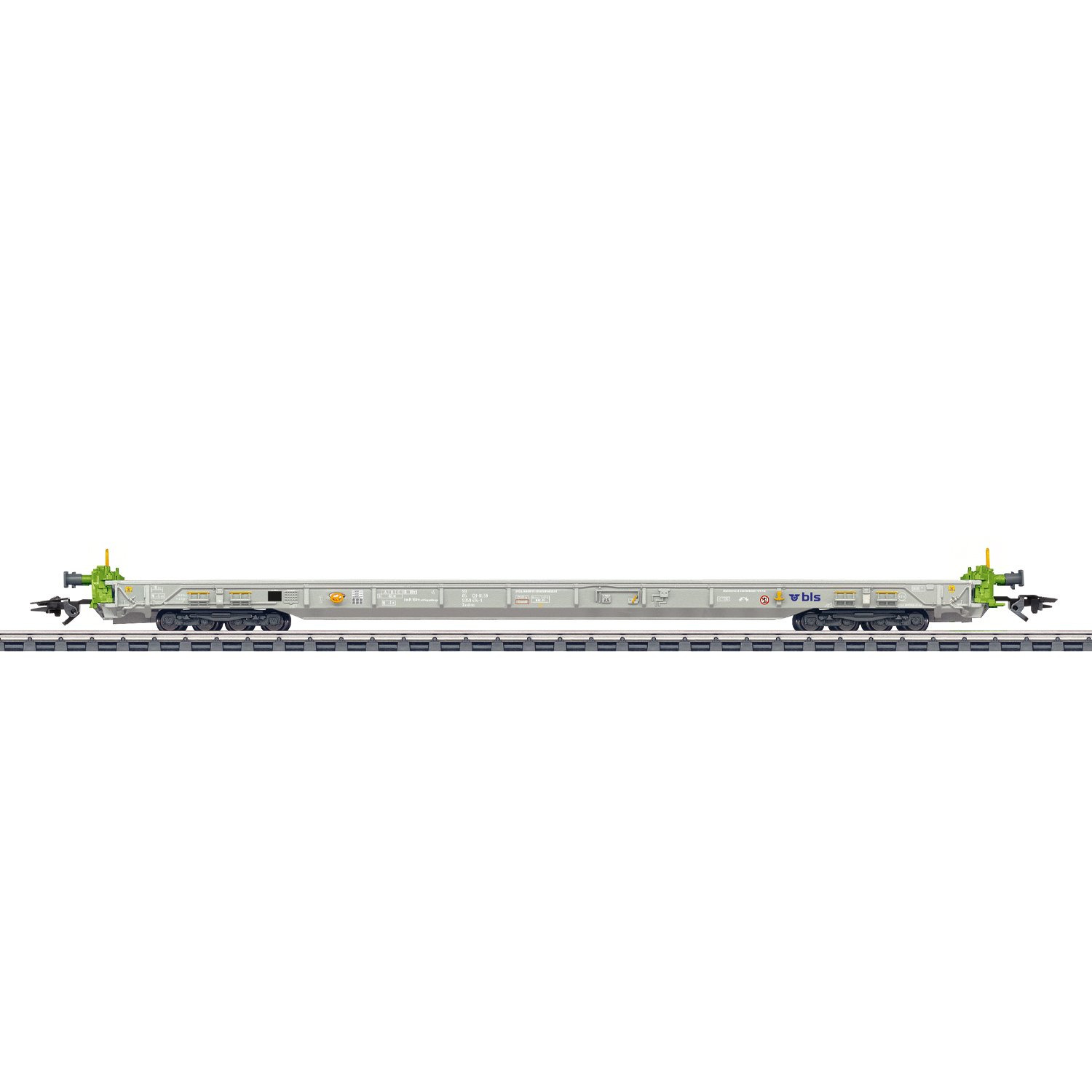 Vorbild: Niederflurtransportwagen Bauart Xaadkms der BLS AG. Spezialwagen als Arbeitsdienstwagen für den Transport von Strassenfahrzeugen, die bei Bahnbaustellen benötigt werden. Achatgraue Grundfarbgebung. Betriebszustand ab 2025.