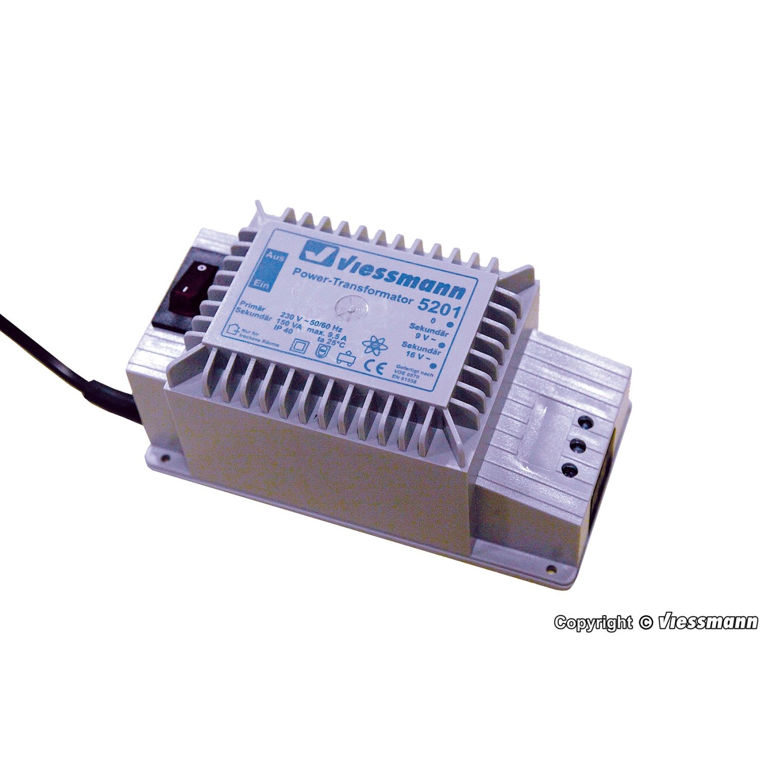 Äußerst leistungsstarker Modellbahn-Transformator zur Versorgung der Beleuchtung ganzer Modell-Städte und zur Magnetartikelsteuerung (für sicheres Schalten vieler Magnetartikel, auch gleichzeitig). Aufgrund der hohen Leistung ist die Verwendung von Hochstromkabel Art. 6895 und 6896 zur Stromverteilung erforderlich. Ein eingebauter Überlastschutz verhindert bei Überlastung und Kurzschluss Beschädigungen, indem er den Netzschalter rechtzeitig abschaltet. Mit beleuchtetem Ein/Aus-Schalter. Technische Daten: Eingangsspannung 230 V ~, Ausgangsspannung 9 und 16 V ~, maximale Leistung 150 VA. Maße: L 17,9 x B 8,9 x H 8,1 cm.