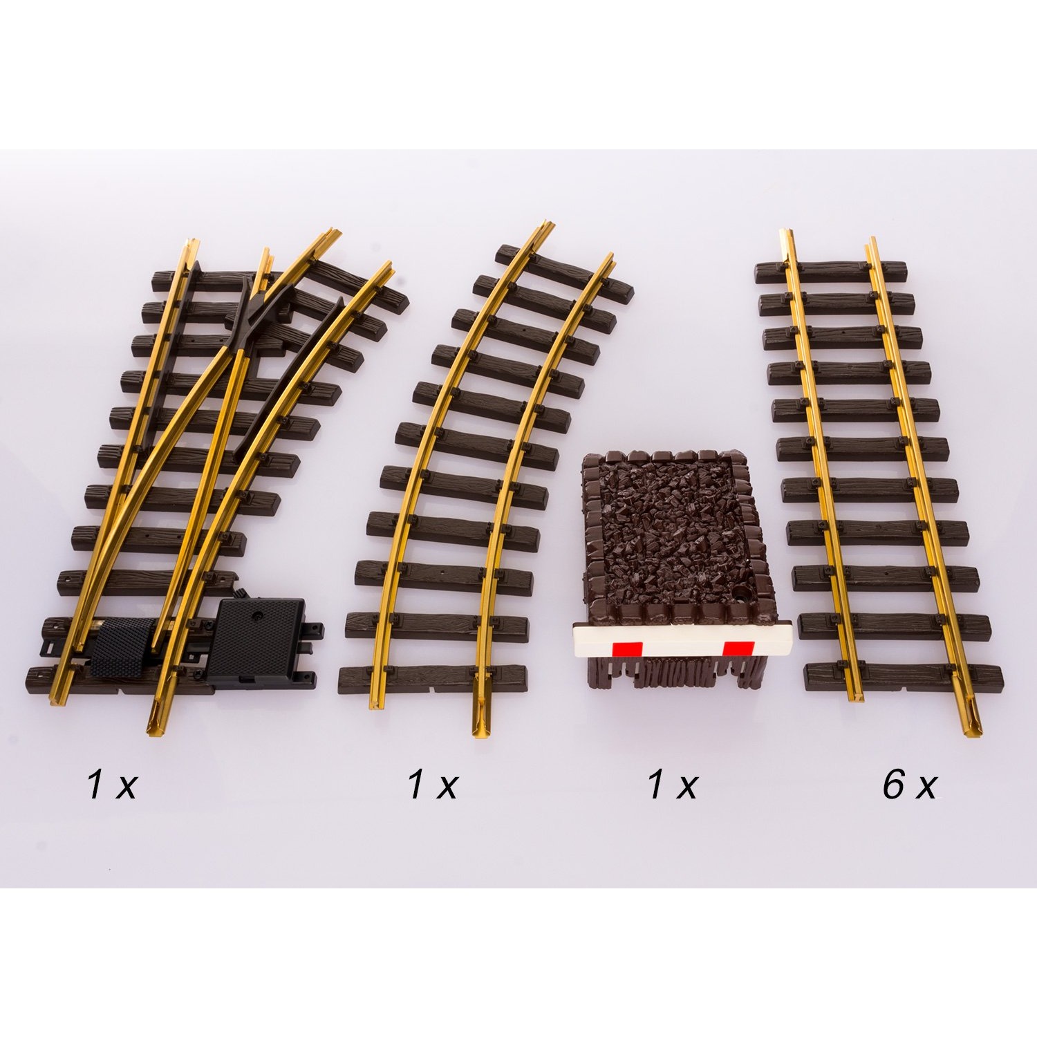 Die stabile Box enthält: 1 x 12000 Handweiche rechts, 6 x 10000 gerade Gleise, 1 x 11000 gebogenes Gleis, 1 x Prellbock