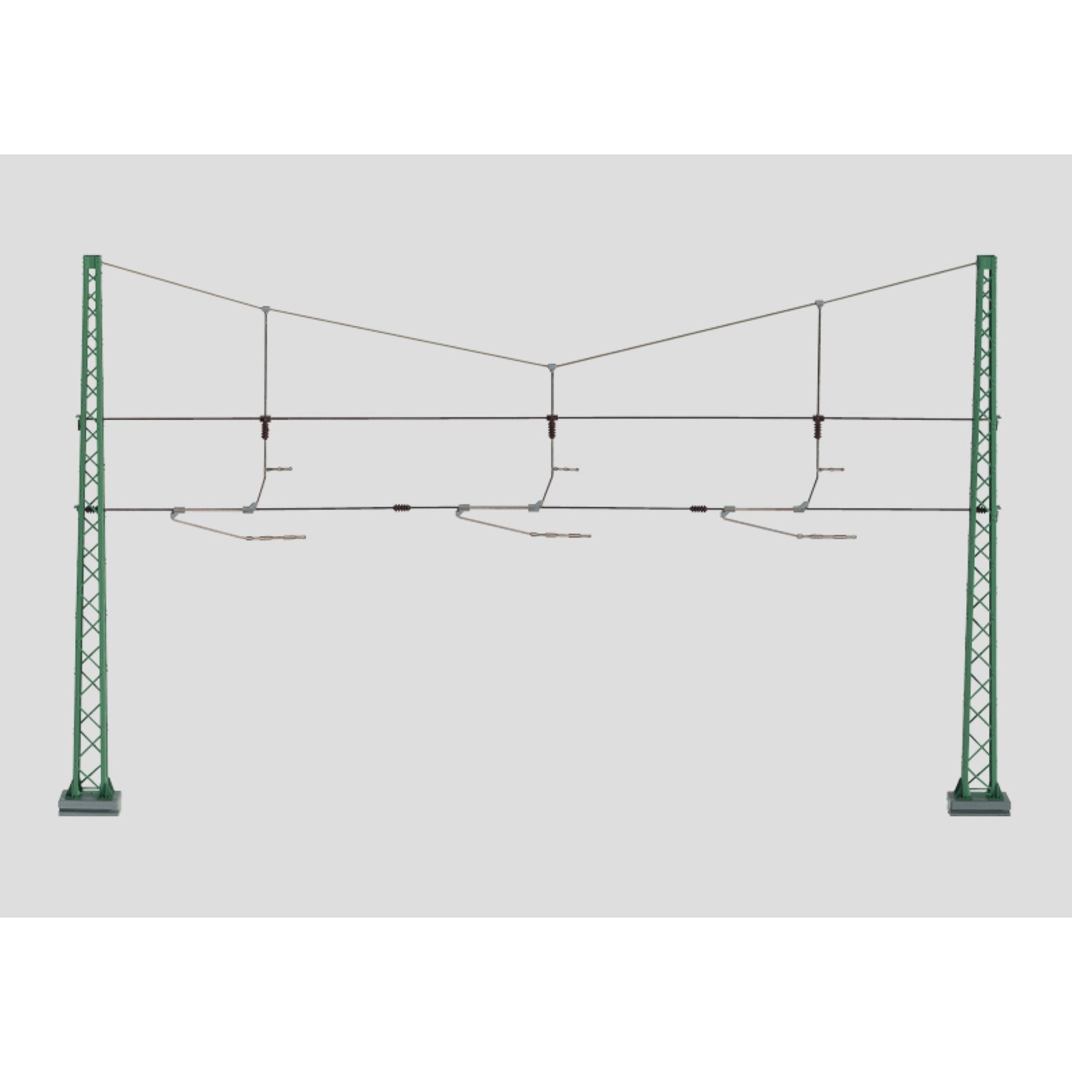 Vormontierte Einheit aus Richtseilen, Quertragseilen und 3 verschiebbaren Fahrdrahthängern. 2 Turmmasten aus Metall auf Sockeln mit Befestigungsschraube und Steckverbindung. Mastabstand bis zu 235 mm einstellbar. Richtseile aus geschweißtem Stahldraht, Quertragseile elastisch, Masten und Fahrdrahthalter elektrisch getrennt. Masthöhe 150 mm.
