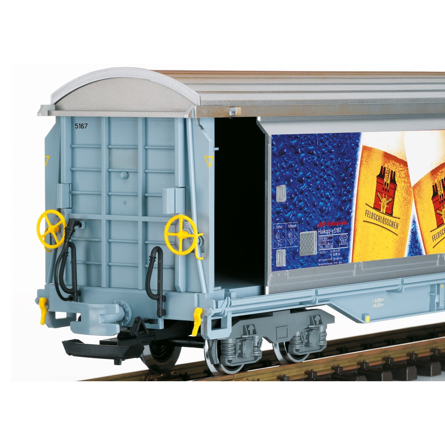 Die vierachsigen Schiebewandwagen sind aus dem Bahnbetrieb der Rhätischen Bahn nicht mehr wegzudenken. Ein grosser Vorteil dieser Wagen ist, dass sie einfach und schnell zu beladen sind, in der Regel werden mit dem Gabelstapler ganze Paletten eingeladen. Viele der Wagen sind werbewirksam gestaltet, so auch der Wagen mit der Nummer Haikqq-y 5167, der im Design der Brauerei Feldschlösschen aus Rheinfelden gestaltet ist.