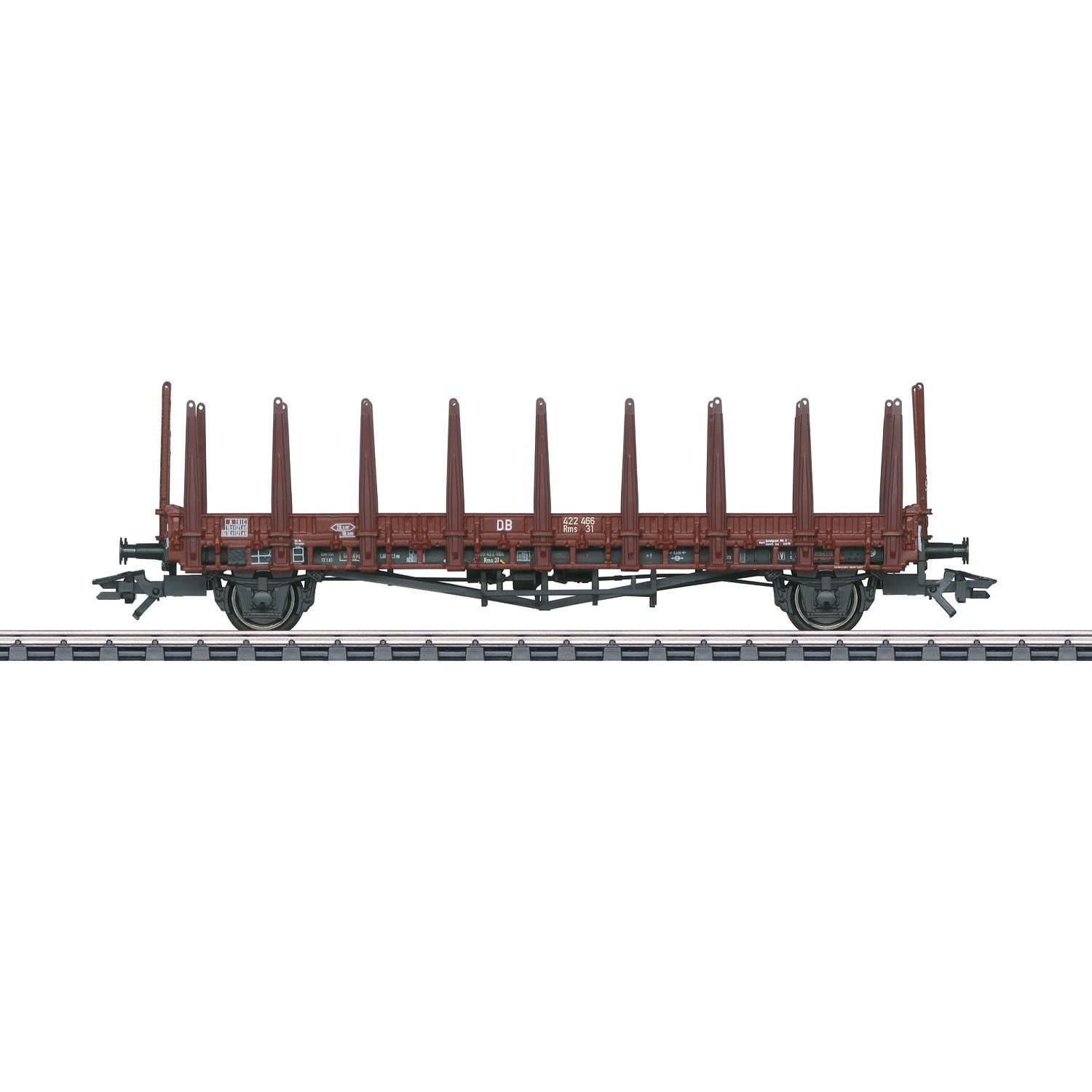 Modell: Mit Sprengwerk und Staukästen am Untergestell, Gleitachslagern und Kopfstücken mit Durchbrüchen. Einsteckbare Rungen liegen bei. Länge über Puffer ca. 13,9 cm.