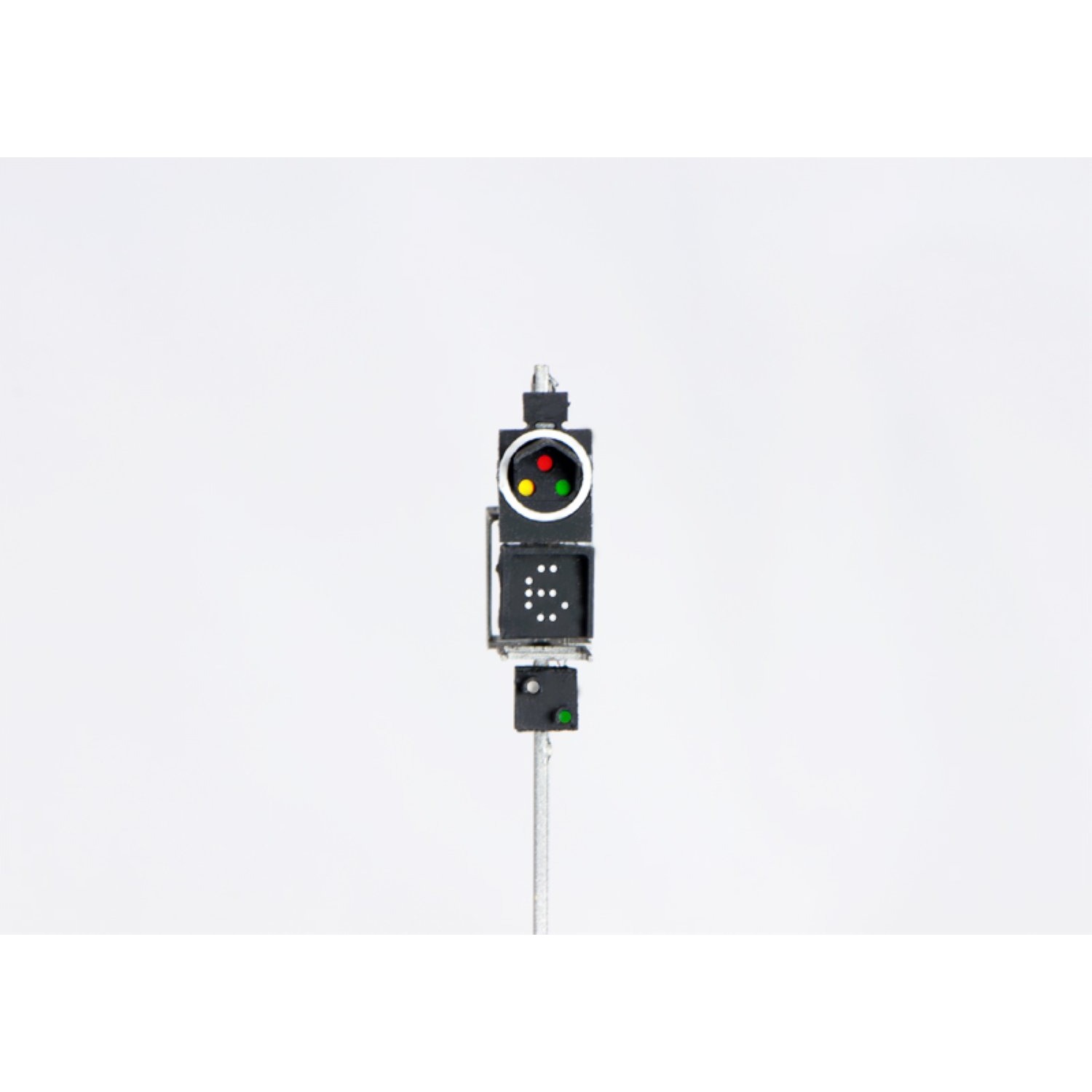 Die Vorwiderstände und eine Schutzdiode gegen Falschpolung der Leuchtdioden sind in der ansteckbaren Platine im Sockel Typ "C" integriert. Alle Leuchtdioden können einzeln angesteuert werden, wodurch alle Fahrbegriffe dargestellt werden können. Das Signal kann ideal mit dem Signalmodul 72442 von Märklin geschaltet werden. Damit wird erreicht, dass die Züge vorbildrichtig langsam vor einem auf "Halt" stehenden Signal anhalten und bei "freier Fahrt" ebenso sanft wieder losfahren. Mit dem Signalmodul 72442 ist nur ein Fahrbegriff rot/grün-orange-grün einstellbar. Das Verdrahtungsschema liegt bei. Sehr einfache Montage.