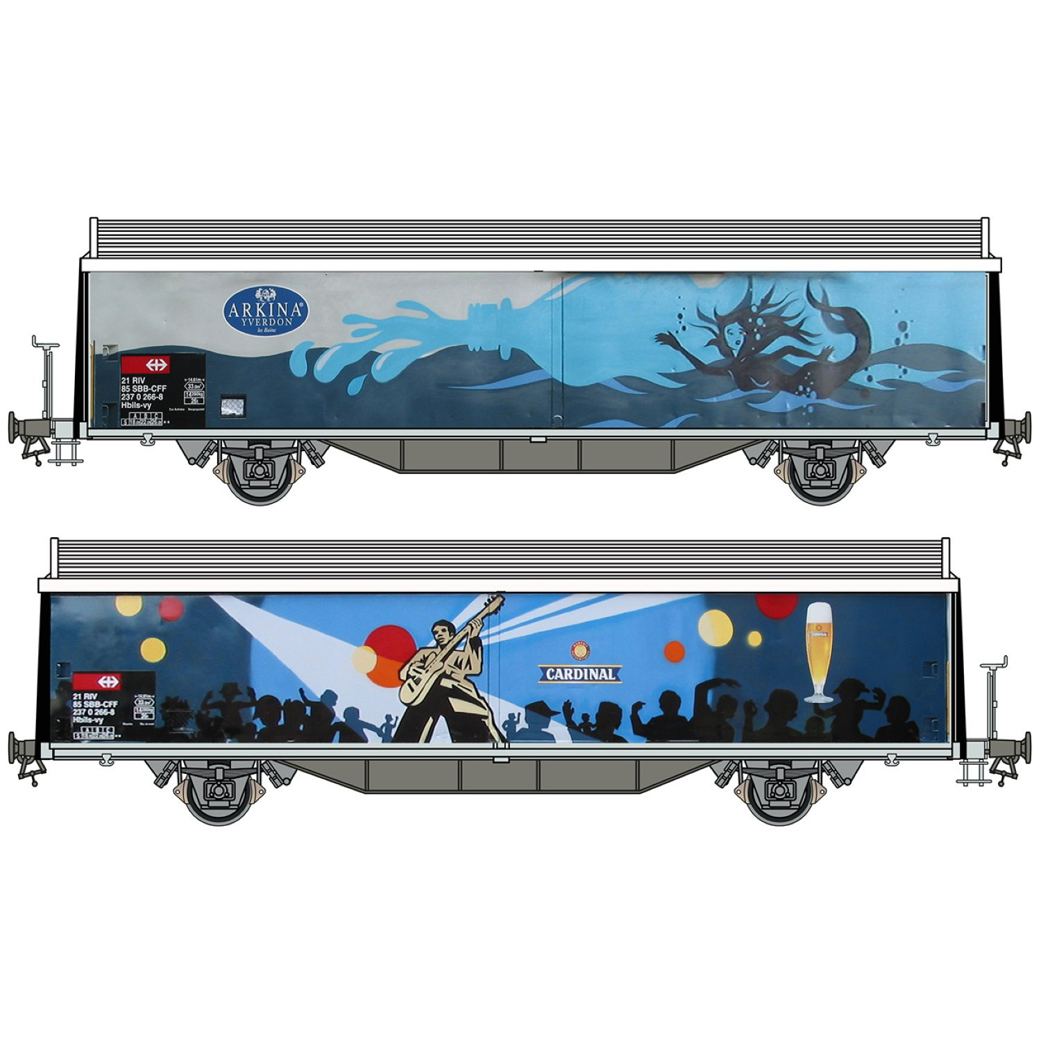 Betriebsnummer 21 RIV 85 SBB-CFF 237 0 266-8, Schiebewände glatt, Stirnwände gesickt, Dachfarbe weiss.• Räder Edelstahl