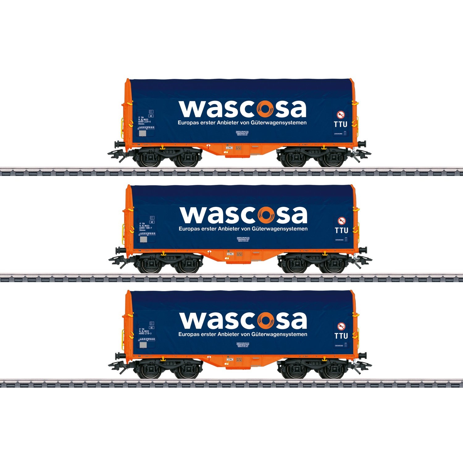 Modell: Alle Wagen mit geschlossener Plane. Drehgestelle der Bauform Y25. Alle Wagen mit unterschiedlichen Betriebsnummern und jeweils einzeln verpackt. Zusätzliche Umverpackung. Länge über Puffer je Wagen ca. 13,8 cm.