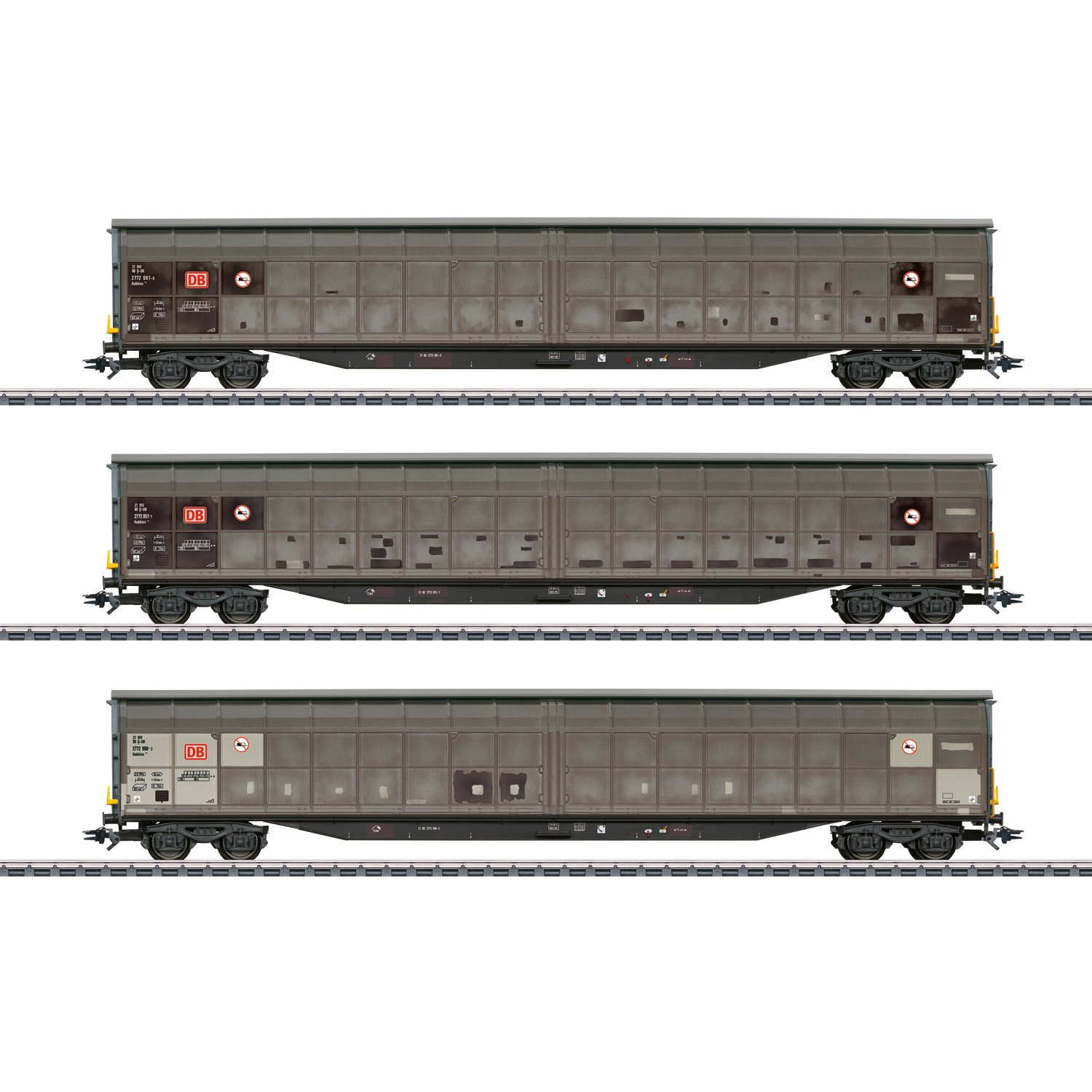 Modell: Verstellbare Puffer und Drehgestelle. Grossflächig gealtert. Alle Wagen einzeln verpackt in zusätzlicher Umverpackung. Länge über Puffer je Wagen ca. 26,7 cm.