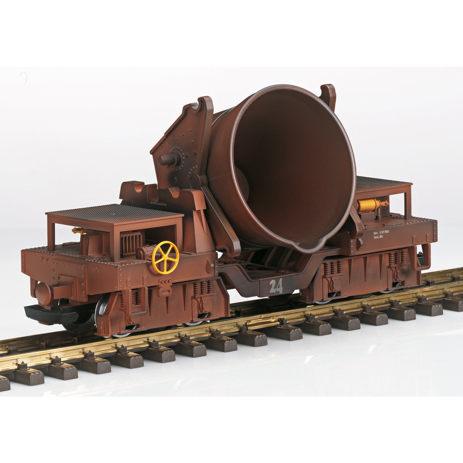 Modell eines Schlackenwagens, wie er in vielen Stahlwerken verwendet wird um Schlacke oder auch geschmolzenen Stahl zu transportieren. Farbgebung und Beschriftung passend zum Einsatzzweck, mit entsprechender Alterung. Die Mulde kann digital gesteuert entleert werden. Länge über Puffer 32 cm.