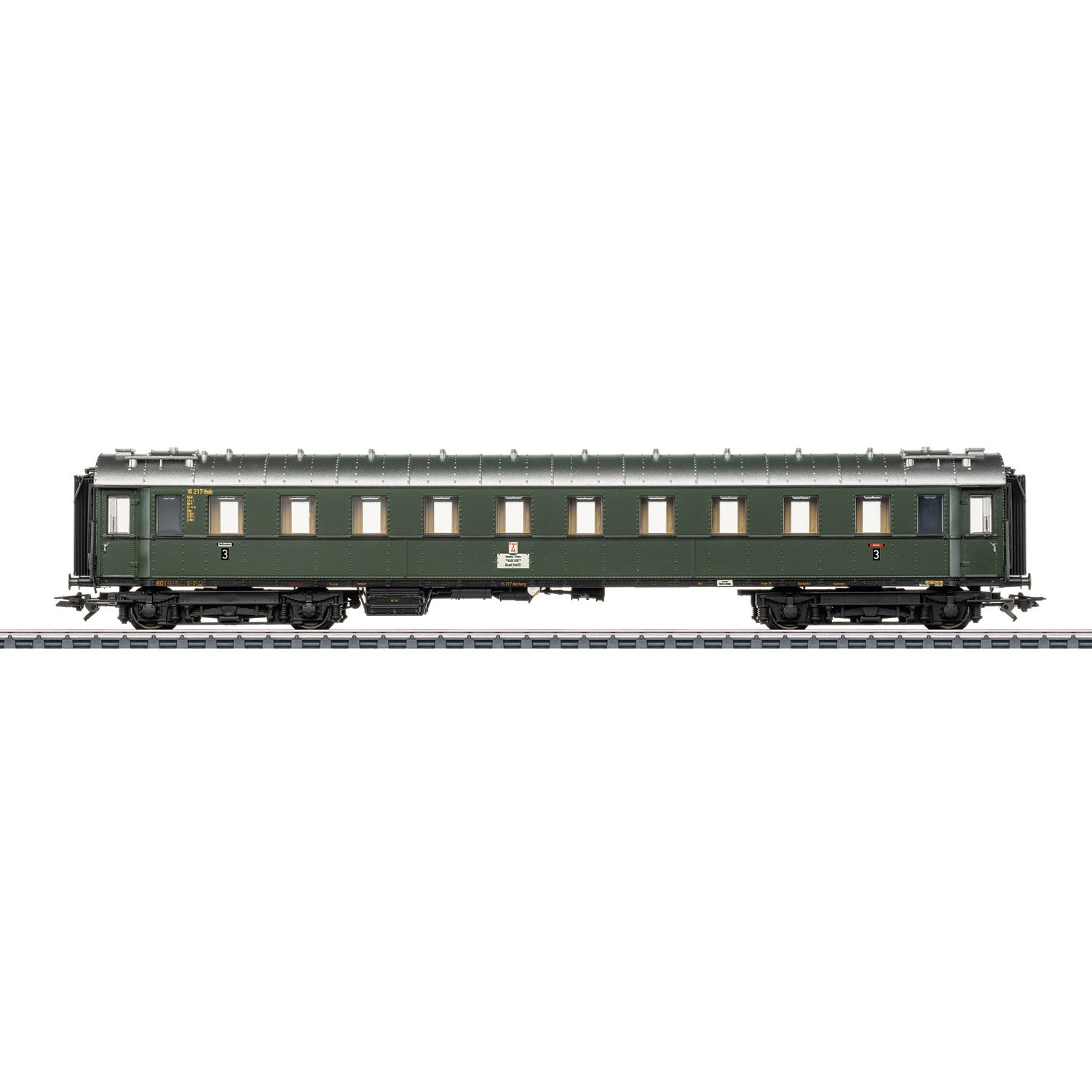 Modell: Detaillierte Ausführung in vollem Längenmaßstab. Befahrbarer Mindestradius 360 mm. Mit serienmäßig eingebauter LED-Innenbeleuchtung, mit warmweissen Leuchtdioden und Pufferkondensator. Die Innenbeleuchtung funktioniert über die serienmässig eingebauten stromführenden Kurzkupplungen im Verbund mit dem Schnellzugwagen ABC4ü, 1./2./3. Klasse aus Artikel 42491, mit Schleifer zur Stromaufnahme. Dazu ist eine fest definierte Fahrzeugreihenfolge vorgegeben. Ein kurzer Faltenbalg liegt zum Austausch bei. Aufgedrucktes Wagenlaufschild und Ordnungsnummer. Ein Leporello zeigt die Darstellung des gesamten Zuges und die vorbildgerechte Einordnung der einzelnen Wagen im Zug-Verband. Länge über Puffer 25 cm.